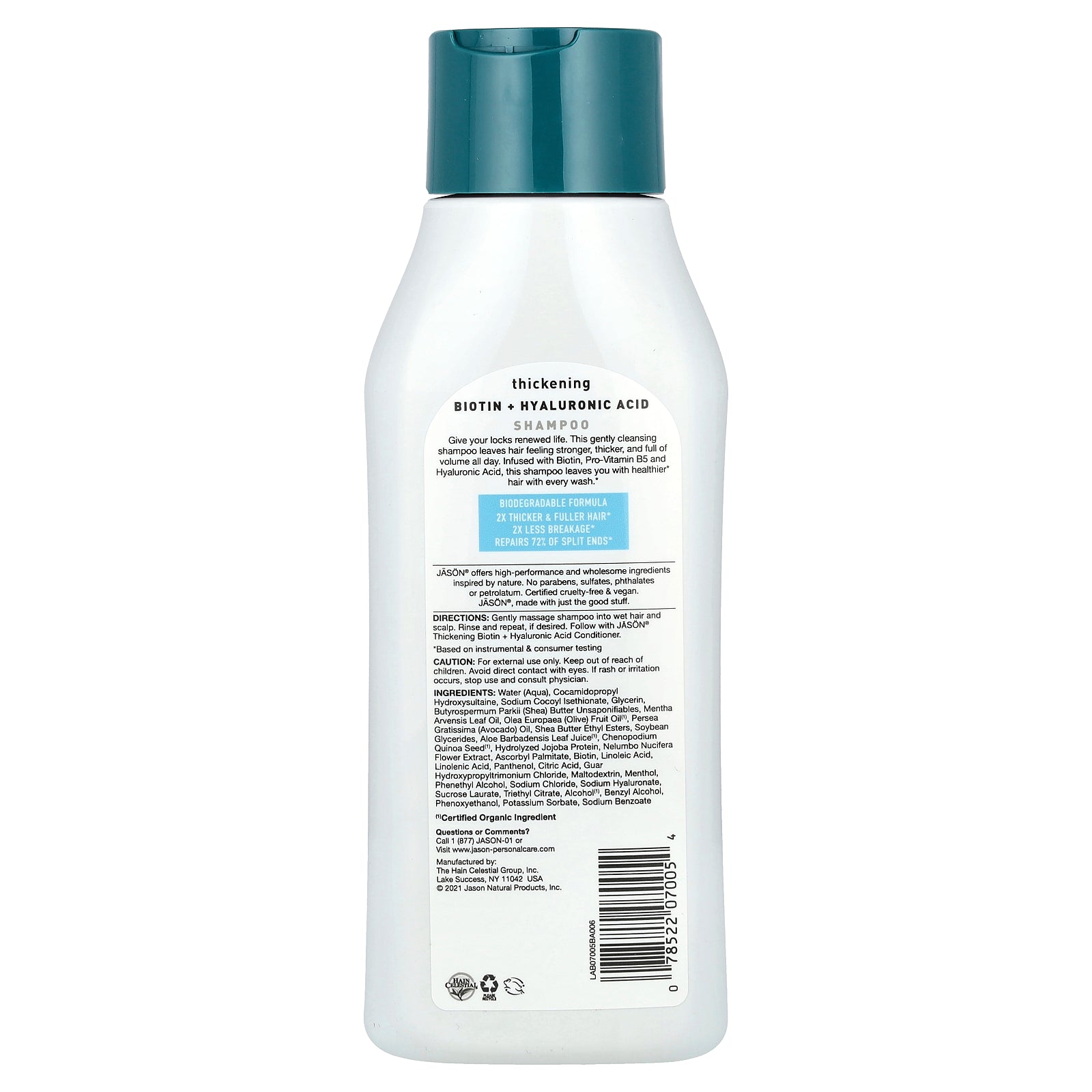 Gently massage shampoo into wet hair and scalp. Rinse and repeat, if desired. Follow with JĀSÖN® Thickening Biotin + Hyaluronic Acid Conditioner.