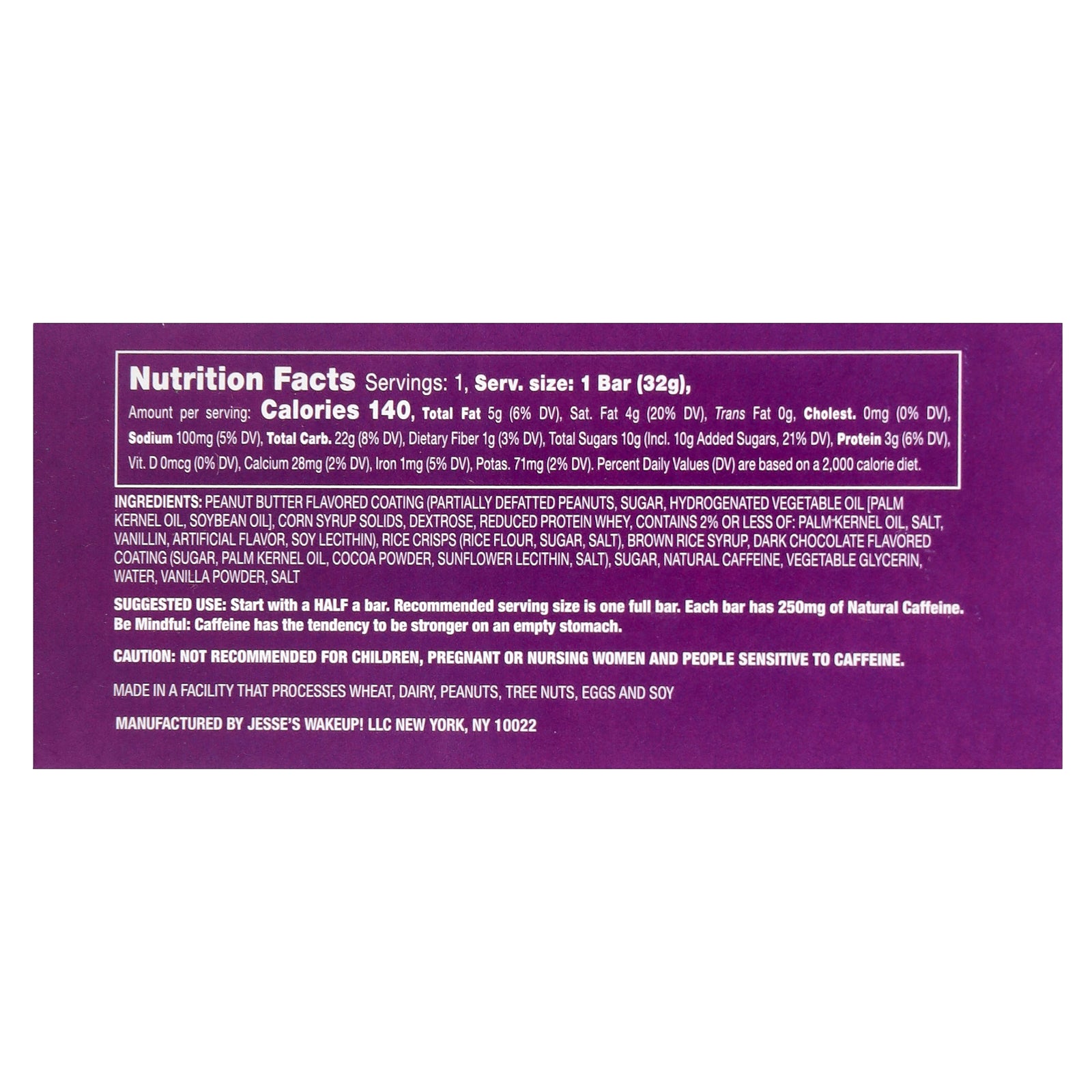 Peanut butter flavored coating (partially defatted peanuts, sugar, hydrogenated vegetable oil [palm kernel oil, soybean oil], corn syrup solids, dextrose, reduced protein whey, contains 2% or less of: palm kernel oil, salt, vanillin, artificial flavor, soy lecithin), rice crisps (rice flour, sugar, salt), brown rice syrup, dark chocolate flavored coating (sugar, palm kernel oil, cocoa powder, sunflower lecithin, salt), sugar, natural caffeine, vegetable glycerin, water, vanilla powder, salt.