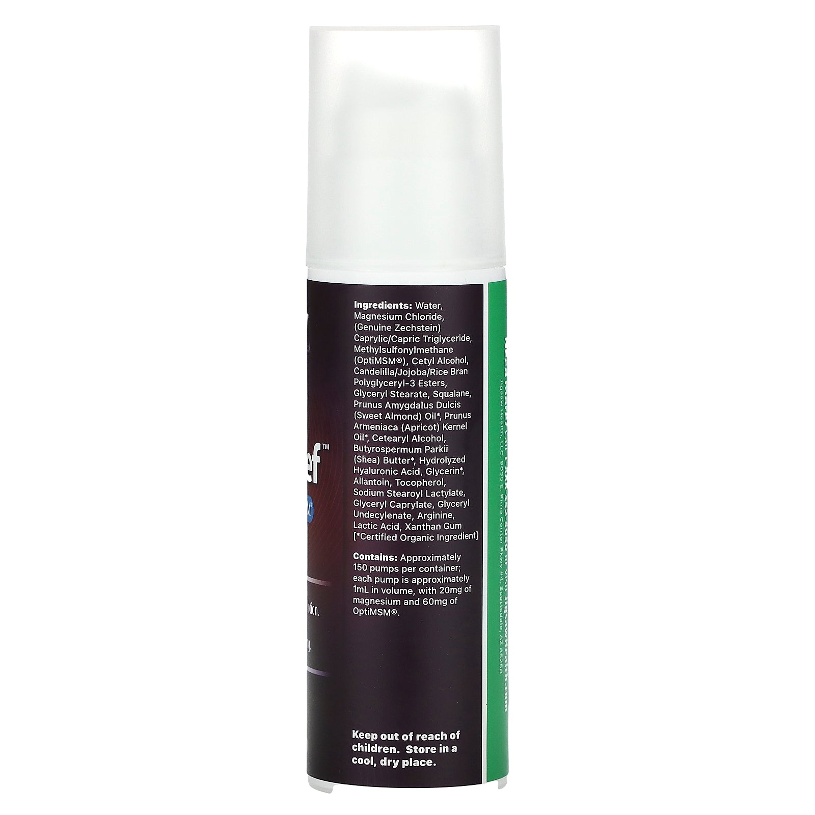 Contains: Approximately 150 pumps per container; each pump is approximately 1 ml in volume, with 20mg of magnesium and 60mg of OptiMSM®.