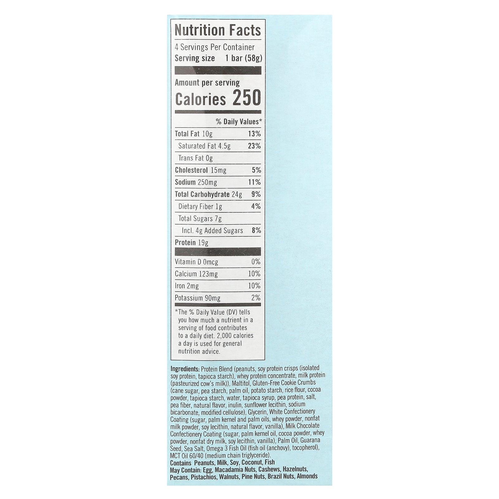 Protein blend (peanuts, soy protein crisps (isolated soy protein, tapioca starch), whey protein concentrate, milk protein (pasteurized cow's milk)), maltitol, gluten-free cookie crumbs (cane sugar, pea starch, palm oil, potato starch, rice flour, cocoa powder, tapioca starch, water, tapioca syrup, pea protein, salt, pea fiber, natural flavor, inulin, sunflower lecithin, sodium bicarbonate, modified cellulose), glycerin, white confectionery coating (sugar, palm kernel and palm oils, whey powder, nonfat milk powder, soy lecithin, natural flavor, vanilla), milk chocolate confectionery coating (sugar, palm kernel oil, cocoa powder, whey powder, nonfat dry milk, soy lecithin, vanilla), palm oil, guarana seed, sea salt, omega 3 fish oil (fish oil (anchovy), tocopherol), mct oil 60/40 (medium chain triglyceride).