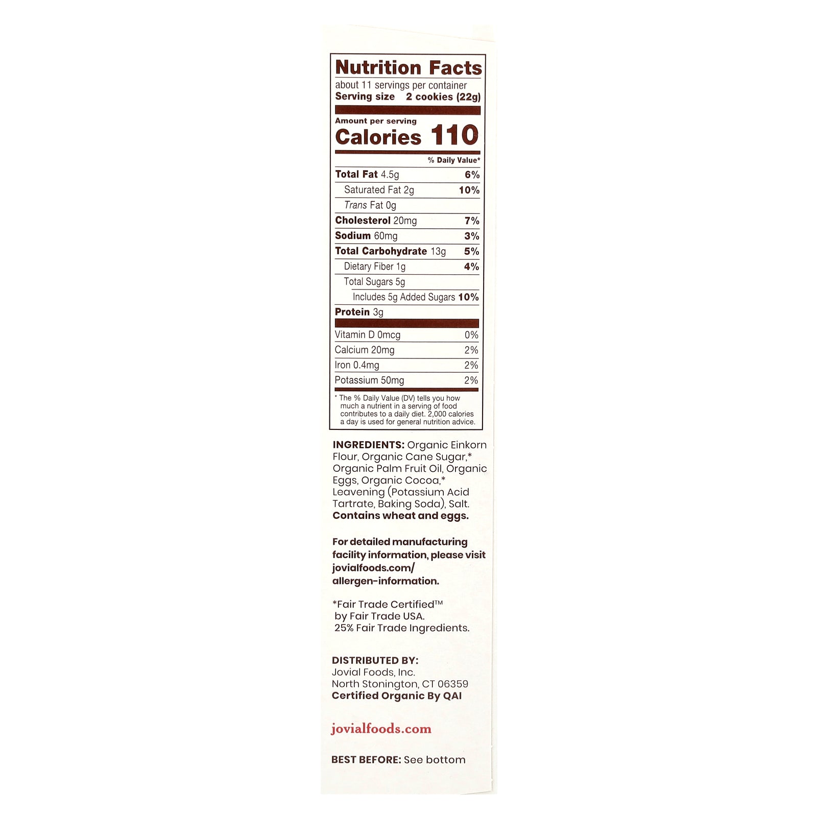 Organic einkorn flour, organic cane sugar*, organic palm fruit oil, organic eggs, organic cocoa*, leavening (potassium acid tartrate, baking soda), salt.