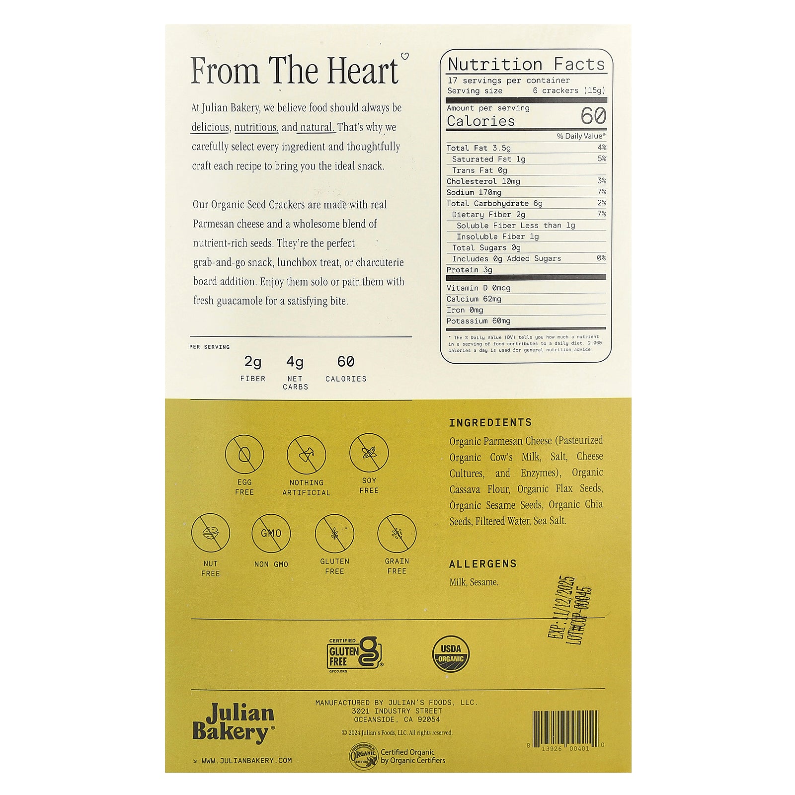 Our Organic Seed Crackers are made with real Parmesan cheese and a wholesome blend of nutrient-rich seeds. They're the perfect grab-and-go snack, lunchbox treat, or charcuterie board addition. Enjoy them solo or pair them with fresh guacamole for a satisfying bite.