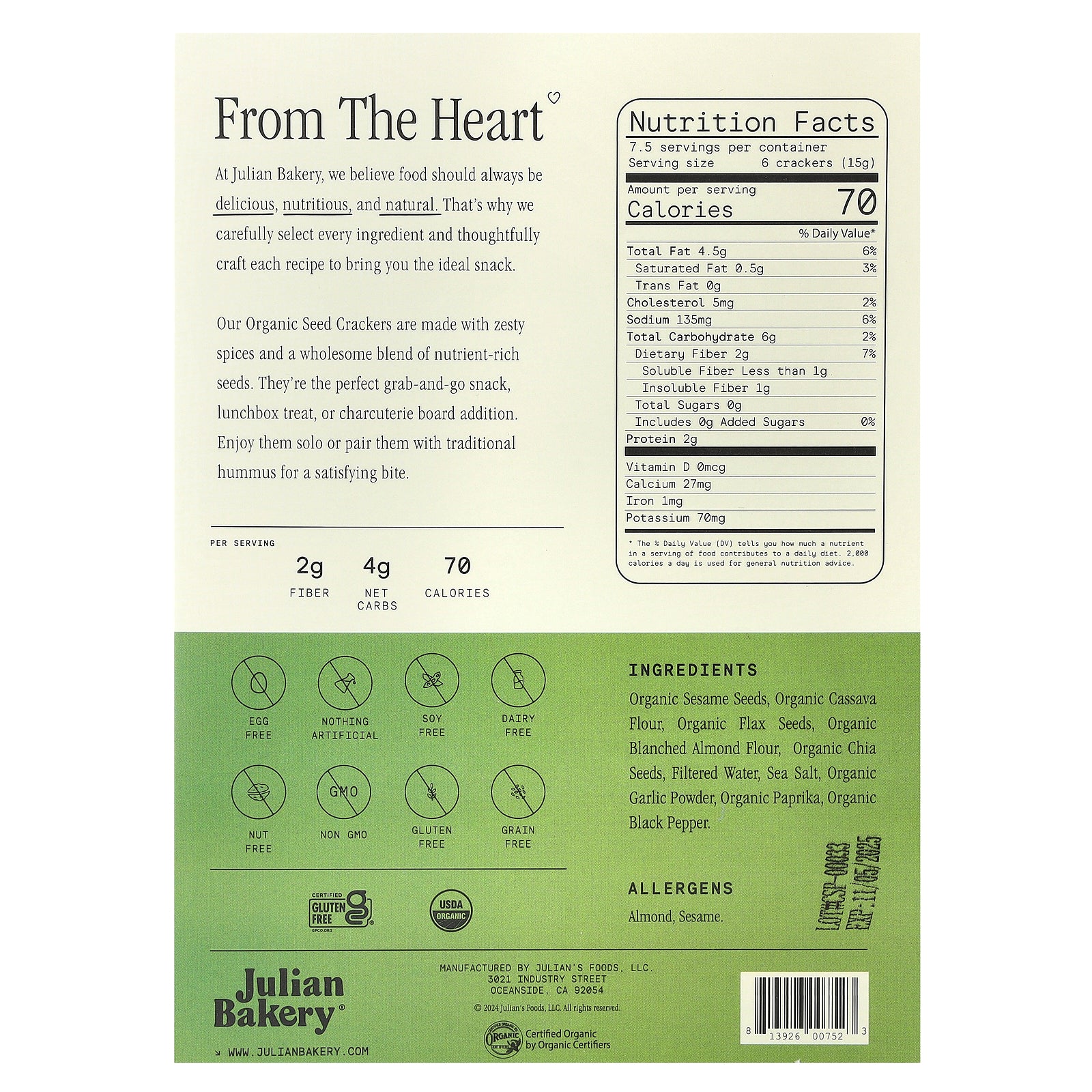 Organic sesame seeds, organic cassava flour, organic flax seeds, organic blanched almond flour, organic chia seeds, filtered water, sea salt, organic garlic powder, organic paprika, organic black pepper.