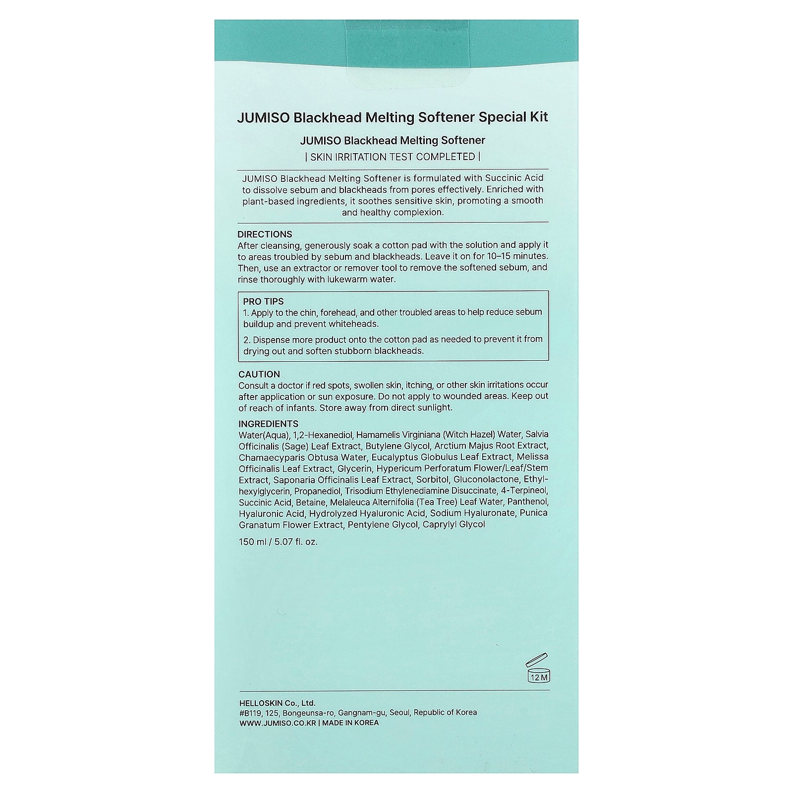 JUMISO Blackhead Melting Softener is formulated with Succinic Acid to dissolve sebum and blackheads from pores effectively. Enriched with plant-based ingredients, it soothes sensitive skin, promoting a smooth and healthy complexion.