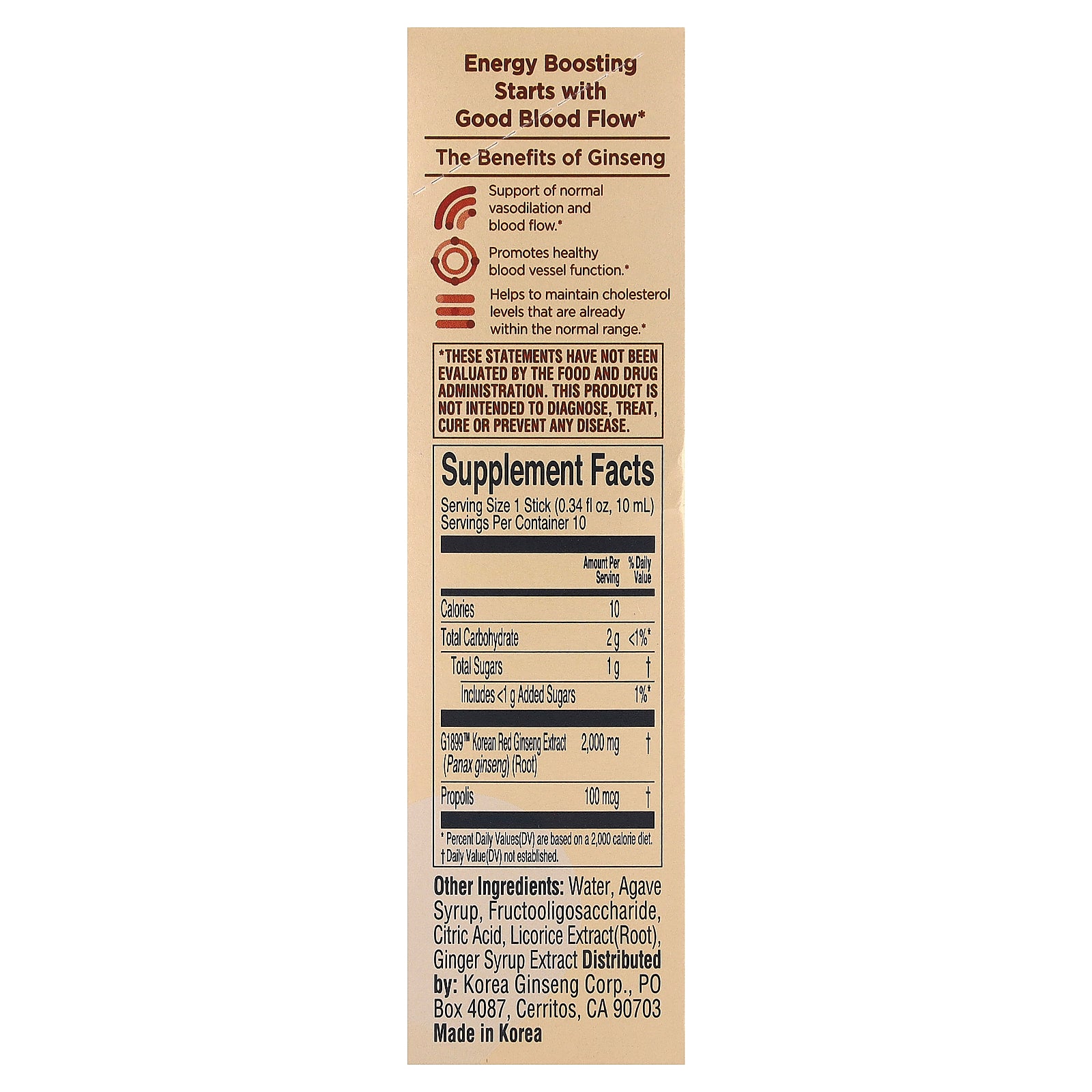 If pregnant, nursing or on medication, consult with healthcare professional before use. Check each ingredient carefully for allergies and interactions. Consume quickly after opening. Contains Korean Red Ginseng Root Extract less than 6 years grown. Keep in a cool, dry place to avoid exposure to sunlight and moisture. Harmless sediment may occur which does not affect the function or quality of product. Do not heat stick in the microwave. Take caution with torn edges.