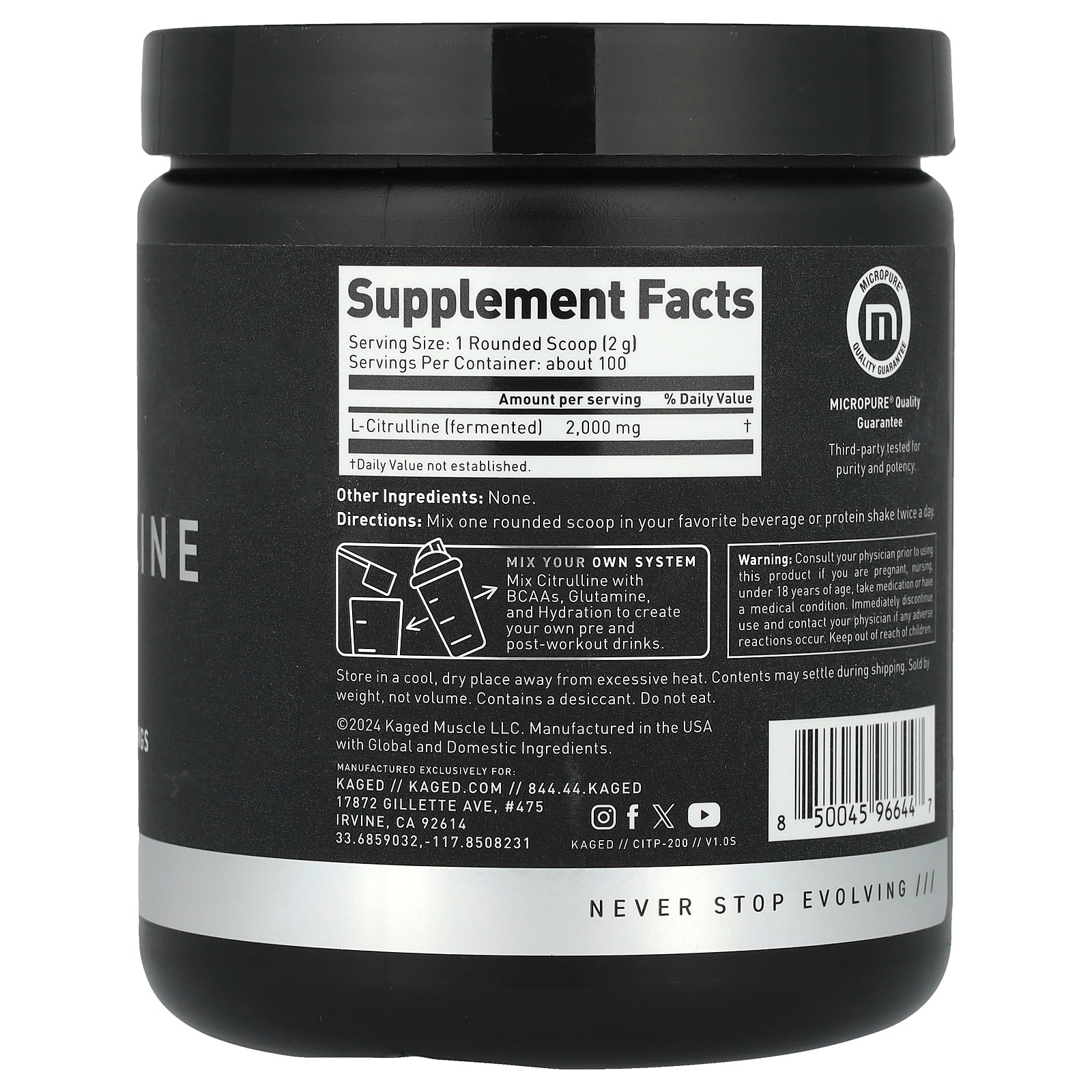 L-Citrulline is an amino acid that raises nitric oxide levels and vasodilation in the body, helping you increase blood flow and muscle pumps during exercise. Kaged L-Citrulline is 100% plant-based, non-GMO, gluten-free, and third-party tested. Mix Kaged L-Citrulline with BCAAs, Glutamine, Creatine, and Hydration for a muscle-building performance matrix.