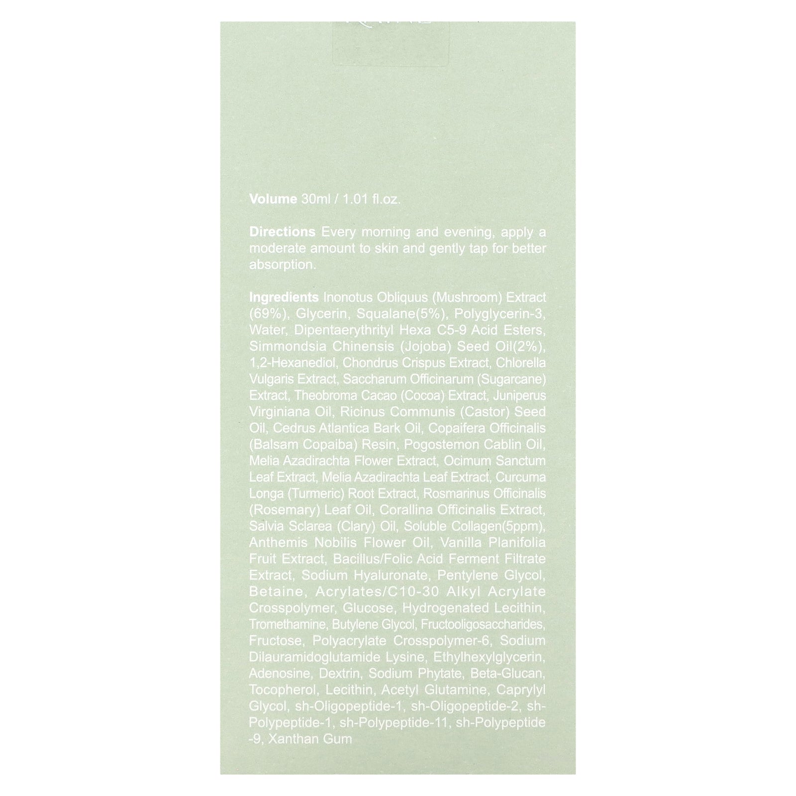 Inonotus obliquus (mushroom) extract, glycerin, squalane, polyglycerin-3, water, dipentaerythrityl hexa c5-9 acid esters, simmondsia chinensis (jojoba) seed oil, 1,2-hexanediol, chondrus crispus extract, chlorella vulgaris extract, saccharum officinarum (sugarcane) extract, theobroma cacao (cocoa) extract, juniperus virginiana oil, ricinus communis (castor) seed oil, cedrus atlantica bark oil, copaifera officinalis (balsam copaiba) resin, pogostemon cablin oil, melia azadirachta flower extract, ocimum sanctum leaf extract, melia azadirachta leaf extract, curcuma longa (turmeric) root extract, rosmarinus officinalis (rosemary) leaf oil, corallina officinalis extract, salvia sclarea (clary) oil, soluble collagen, anthemis nobilis flower oil, vanilla planifolia fruit extract, bacillus/folic acid ferment filtrate extract, sodium hyaluronate, pentylene glycol, betaine, acrylates/c10-30 alkyl acrylate crosspolymer, glucose, hydrogenated lecithin, tromethamine, butylene glycol, fructooligosaccharides, fructose, polyacrylate crosspolymer-6, sodium dilauramidoglutamide lysine, ethylhexylglycerin, adenosine, dextrin, sodium phytate, beta-glucan, tocopherol, lecithin, acetyl glutamine, caprylyl glycol, sh-oligopeptide-1, sh-oligopeptide-2, sh-polypeptide-1, sh-polypeptide-11, sh-polypeptide-9, xanthan gum