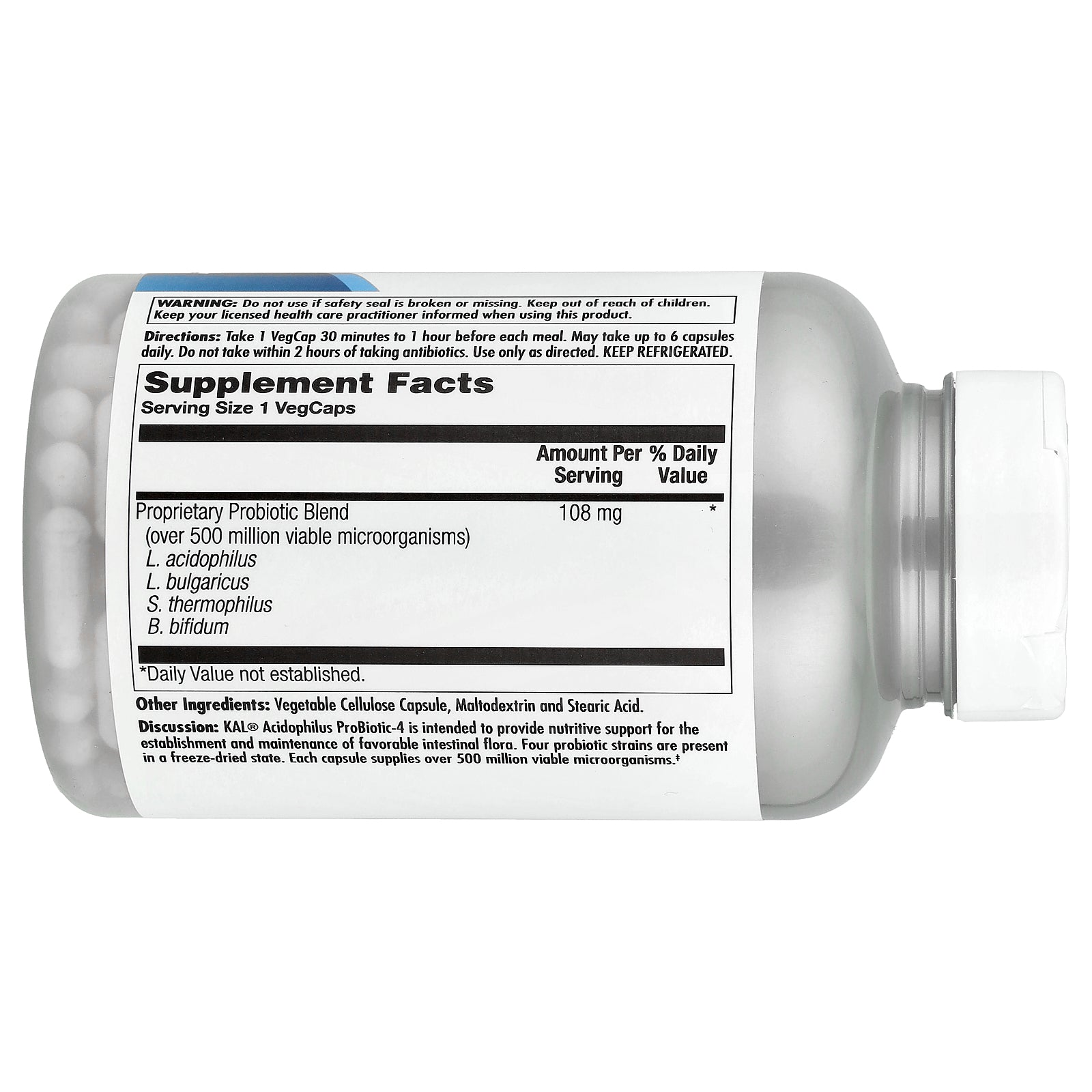 Discussion: KAL® Acidophilus ProBiotic-4 intended to provide nutritive support for the establishment and maintenance of favorable intestinal flora. Four probiotics strains are present in a freeze-dried state. Each capsule supplies over 500 million viable microorganisms.