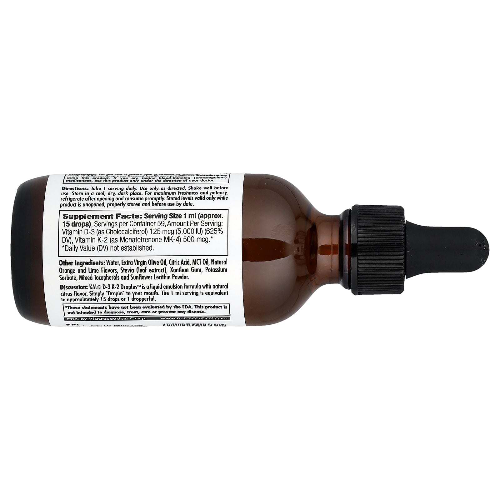 KAL® D-3 K-2 DropIns™ is a liquid emulsion formula with natural citrus flavor. Simply "DropIn" to your mouth. The 1 ml serving is equivalent to approximately 15 drops or 1 dropperful.