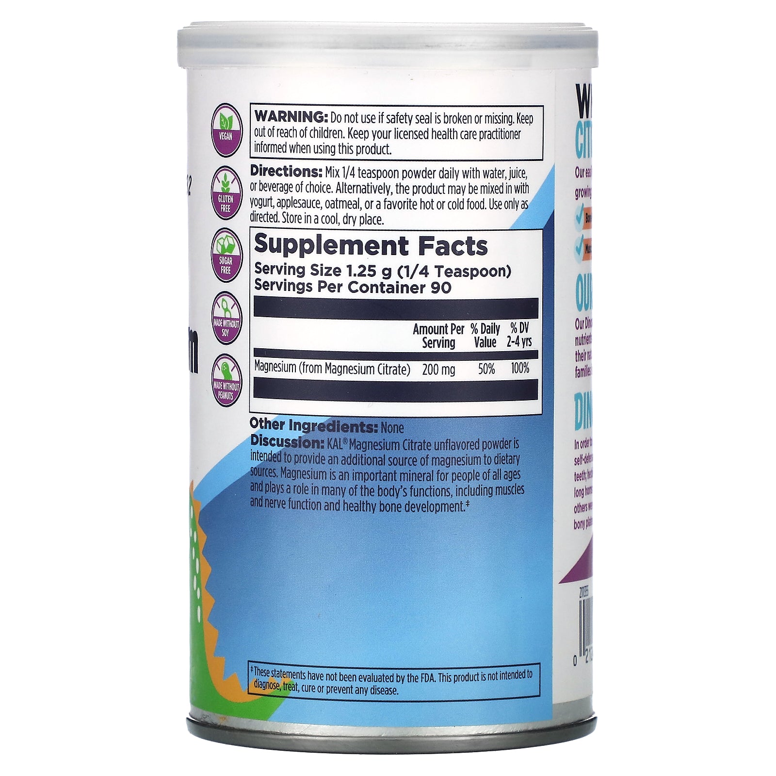 Discussion: KAL® Magnesium Citrate unflavored powder is intended to provide an additional source of magnesium to dietary sources. Magnesium is an important mineral for people of all ages and plays a role in many of the body's functions, including muscles and nerve function and healthy bone development.