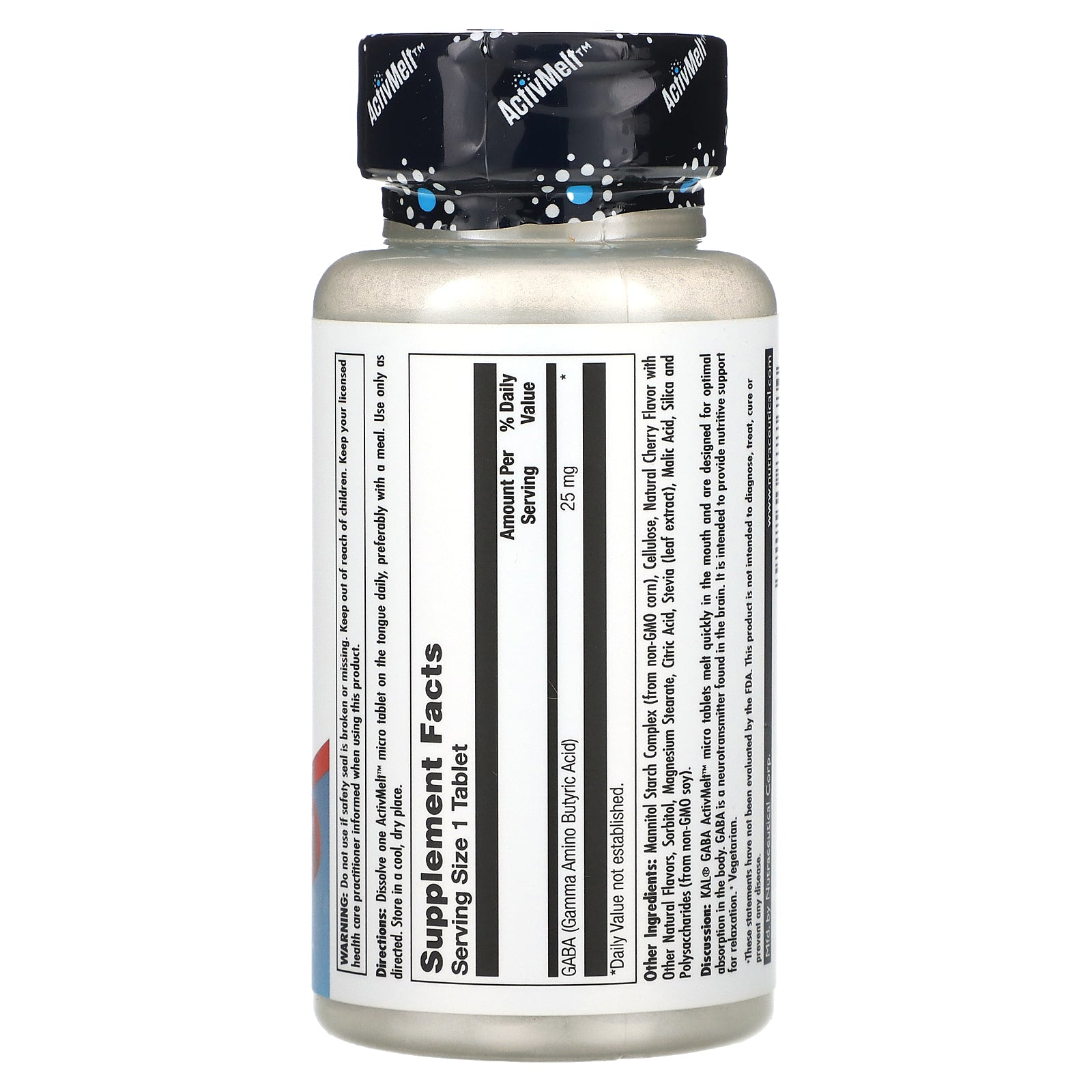 Discussion: KAL® GABA ActivMelt™ micro tablets melt quickly in the mouth and are designed for optimal absorption in the body. GABA is a neurotransmitter found in the brain. It is intended to provide nutritive support for relaxation.