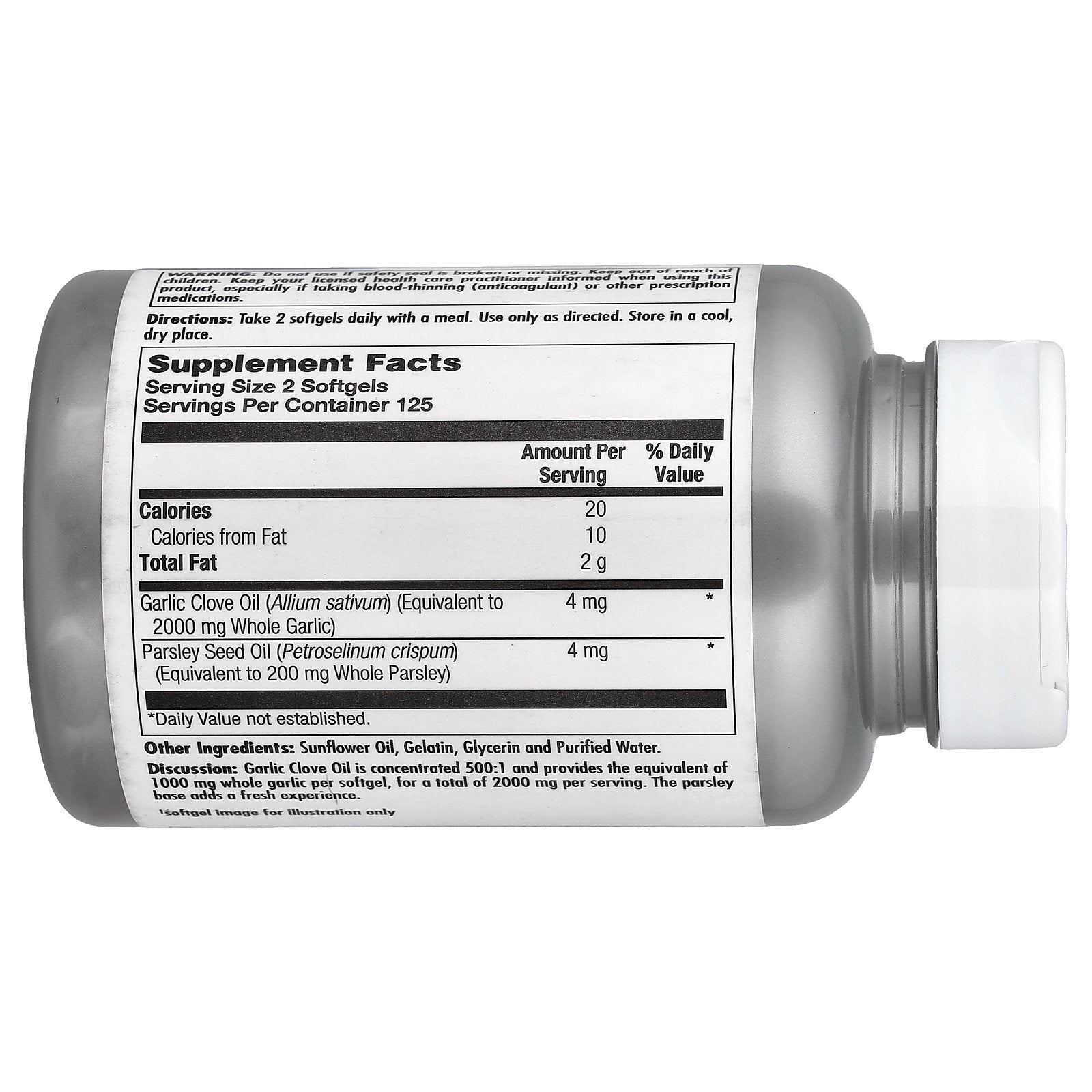 Discussion: Garlic Clove Oil is concentrated 500:1 and provides the equivalent of 1000 mg whole garlic per softgel, for a total of 2000 mg per serving. The parsley base adds a fresh experience.
