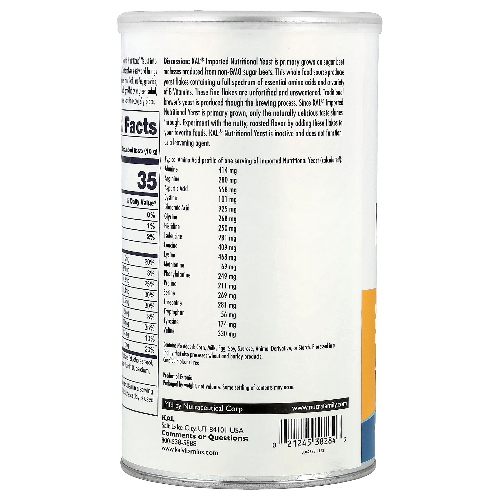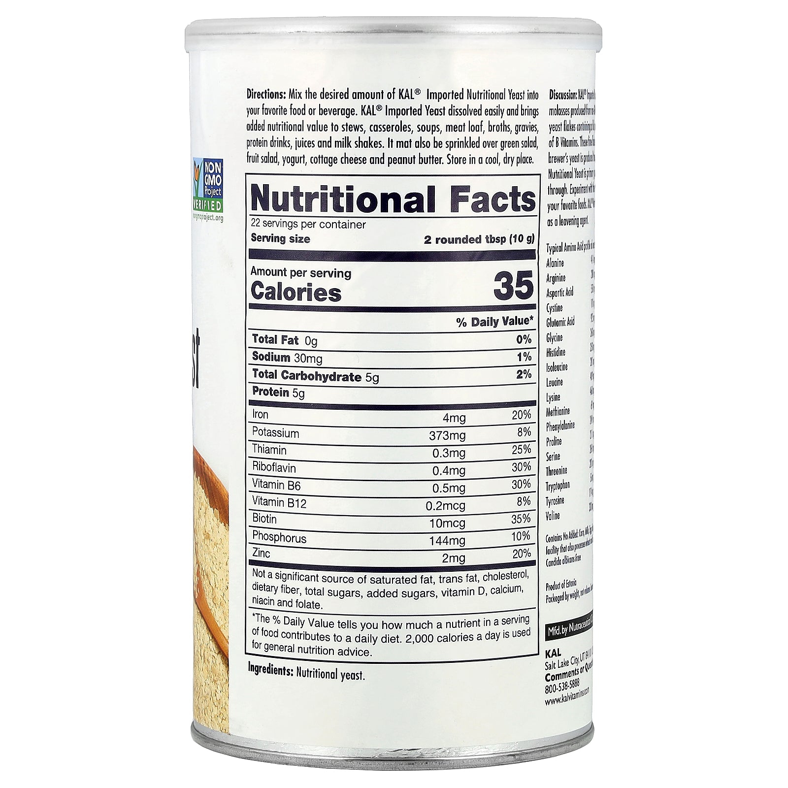 KAL® Imported Nutritional Yeast is primary grown on sugar beet molasses produced from non-GMO sugar beets. This whole food source produces yeast flakes containing a full spectrum of essential amino acids and a variety of B Vitamins. These fine flakes are unfortified and unsweetened. Traditional brewer's yeast is produced though the brewing process. Since KAL® Imported Nutritional Yeast is primary grown, only the naturally delicious taste shines through. Experiment with the nutty, roasted flavor by adding these flakes to your favorite foods. KAL® Nutritional Yeast is inactive and does not function as a leavening agent.
