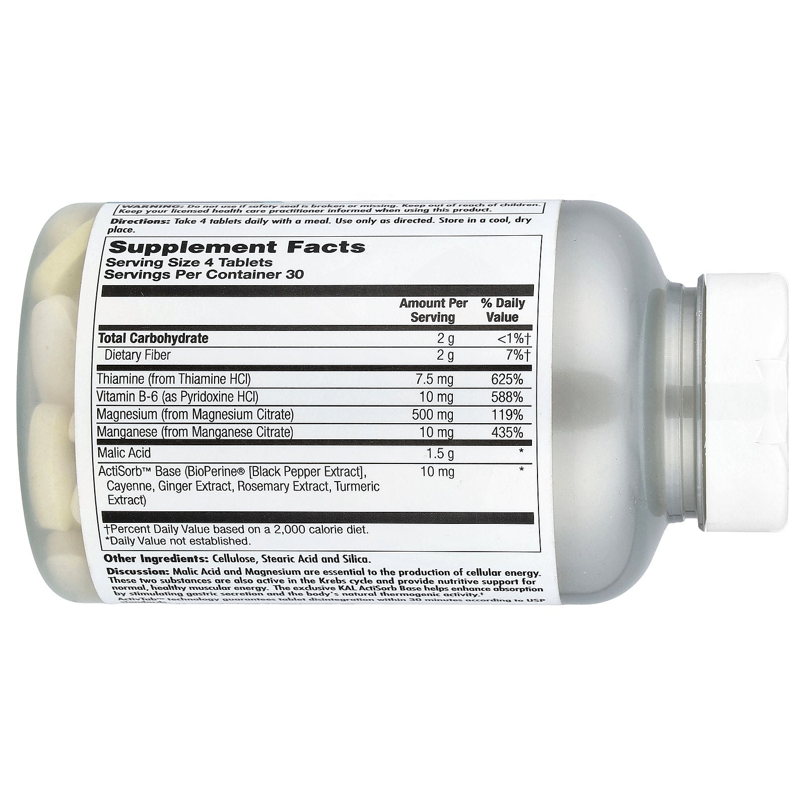 Malic Acid and Magnesium are essential to the production of cellular energy. These two substances are also active in the Krebs cycle and provide nutritive support for normal, healthy muscular energy. The exclusive KAL ActiSorb Base helps enhance absorption by stimulating gastric secretion and the body's natural thermogenic activity.