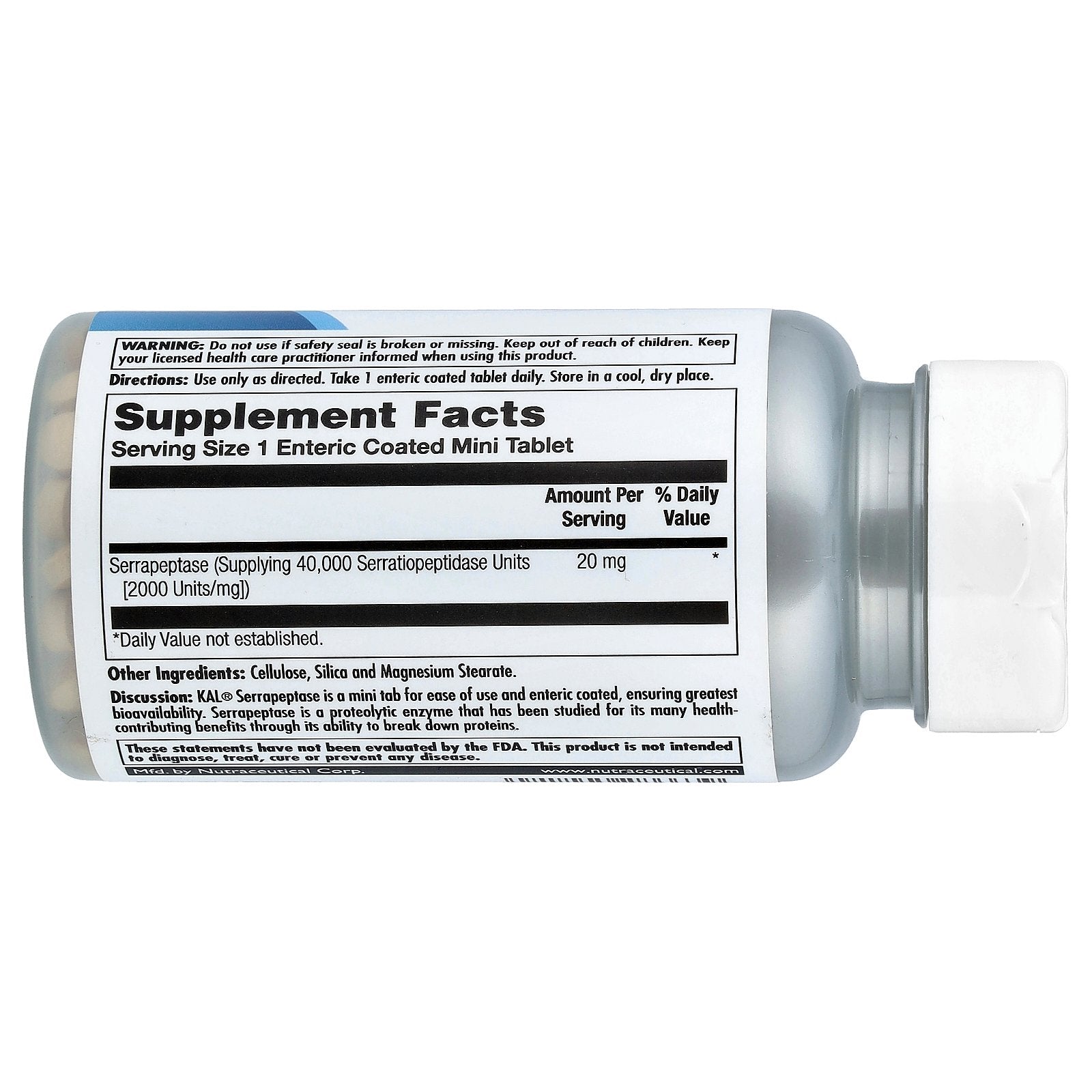 Discussion: KAL® Serrapeptase is a mini tab for ease of use and enteric coated, ensuring greatest bioavailability. Serrapeptase is a proteolytic enzyme that has been studied for its many health- contributing benefits through its ability to break down proteins.