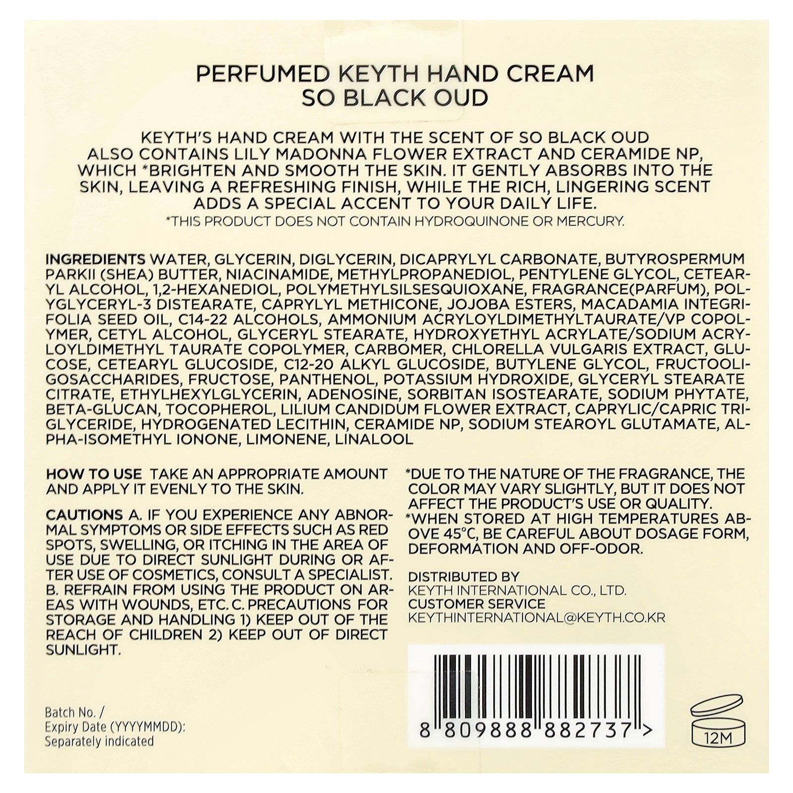 Keyth's hand cream with the scent of So Black Oud also contains Lily Madonna Flower Extract and Ceramide NP, which *brighten and smooth the skin. It gently absorbs into the skin, leaving a refreshing finish, while the rich, lingering scent adds a special accent to your daily life.
