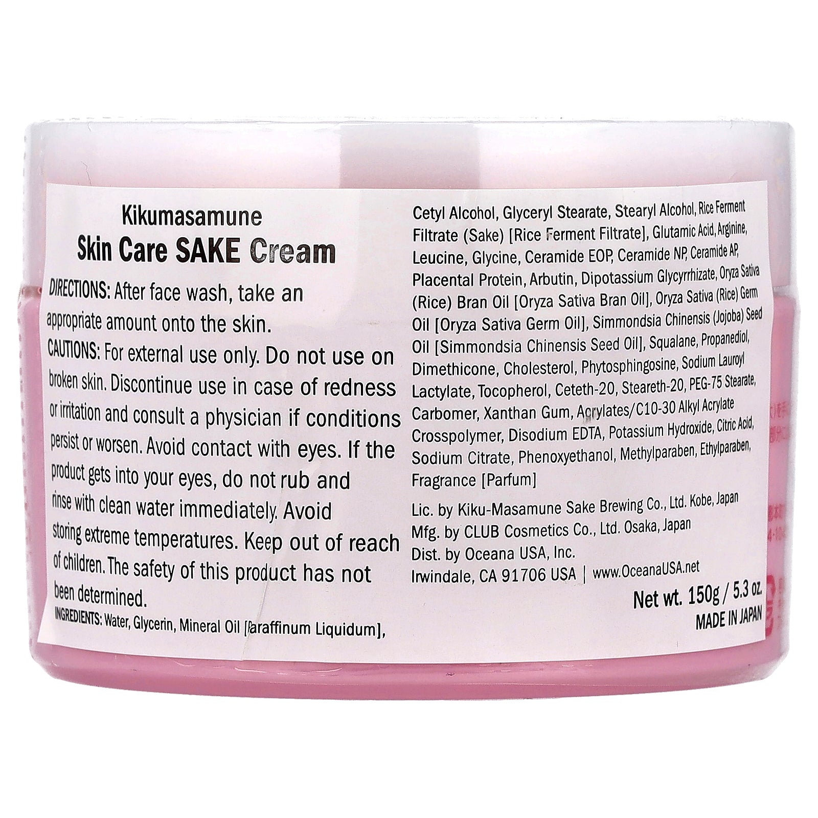 Water, glycerin,mineral oil [paraffinum liquidum], cetyl alcohol, glyceryl stearate, stearyl alcohol, rice ferment filtrate (sake) (rice ferment filtrate), glutamic acid, arginine, leucine, glycine, ceramide eop, ceramide np, ceramide ap, placental protein, arbutin, dipotassium glycyrrhizate, oryza sativa (rice) bran oil [oryza sativa bran oil], oryza sativa (rice) germ oil [oryza sativa germ oil], simmondsia chinensis (jojoba) seed oil [simmondsia chinensis seed oil], squalane, propanediol, dimethicone, cholesterol, phytosphingosine, sodium lauroyl lactylate, tocopherol, ceteth-20, steareth-20, peg-75 stearate, carbomer, xanthan gum, acrylates/c10-30 alkyl acrylate crosspolymer, disodium edta, potassium hydroxide, citric acid, sodium citrate, phenoxyethanol, methylparaben, ethylparaben, fragrance.