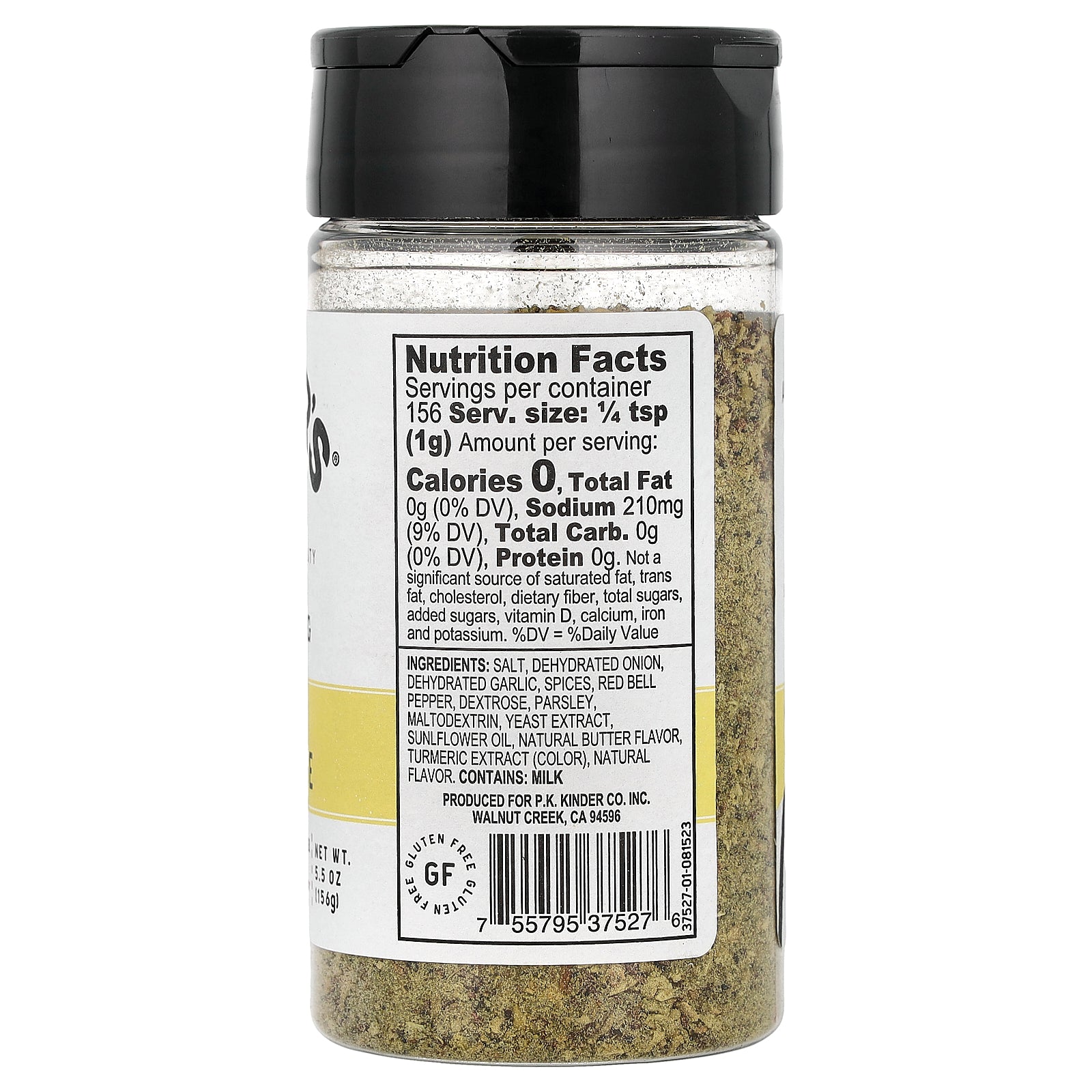 Salt, dehydrated onion, dehydrated garlic, spices, red bell pepper, dextrose, parsley, maltodextrin, yeast extract, sunflower oil, natural butter flavor, turmeric extract (color), natural flavor.