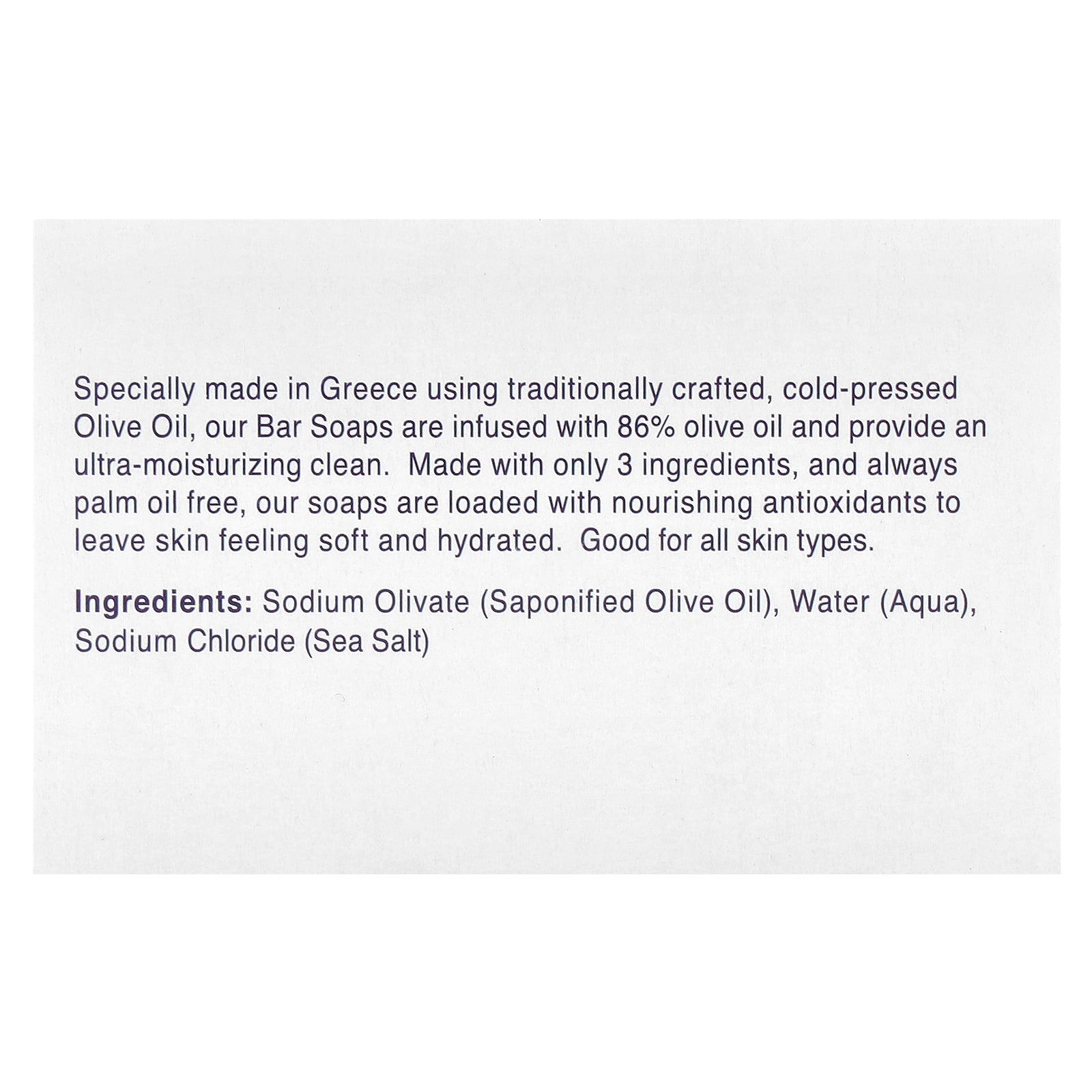 Specially made in Greece using traditionally crafted, cold-pressed Olive Oil, our Bar Soaps are infused with 86% olive oil and provide an ultra-moisturizing clean. Made with only 3 ingredients, and always palm oil free, our soaps are loaded with nourishing antioxidants to leave skin feeling soft and hydrated. Good for all skin types.