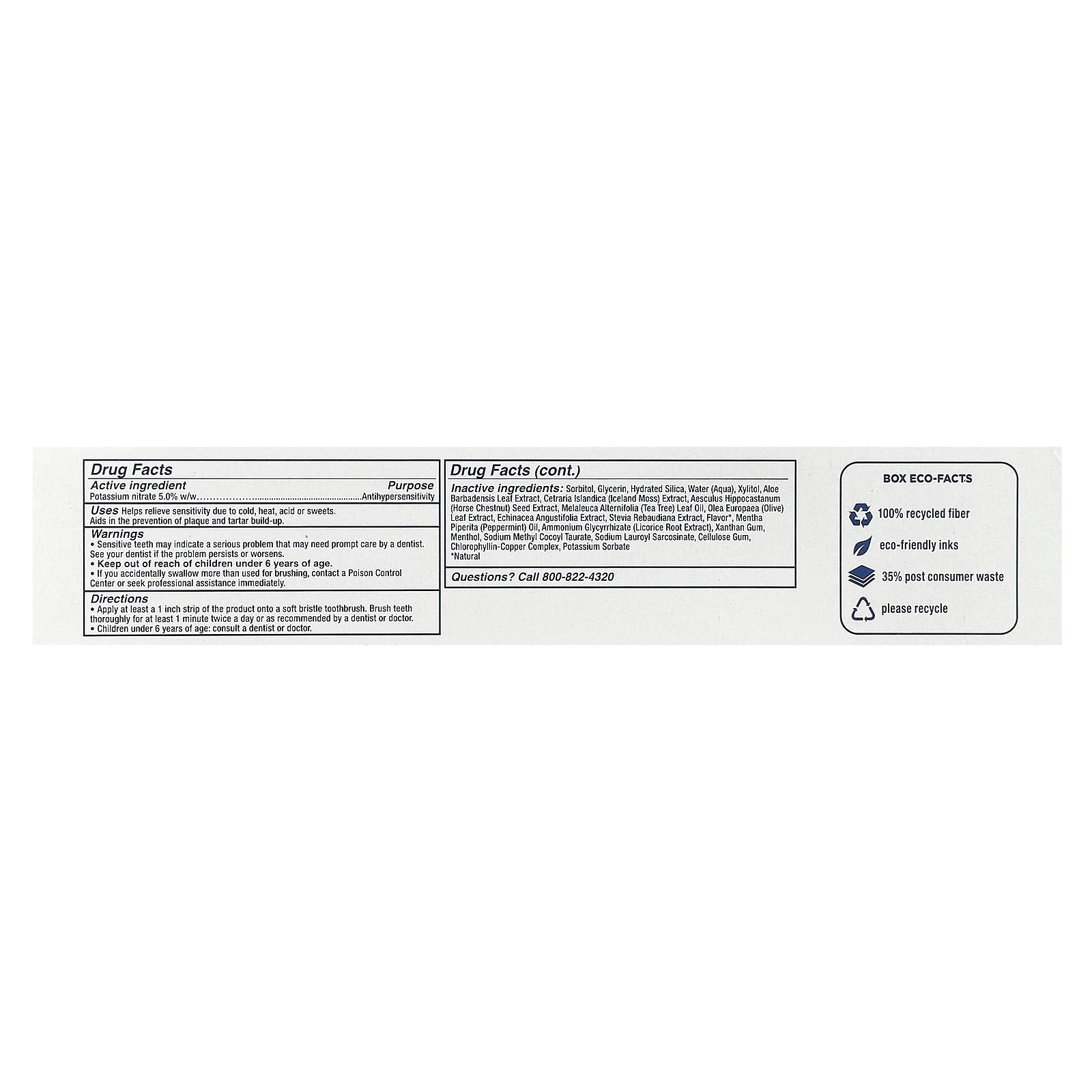 | Sorbitol, glycerin, hydrated silica, water, xylitol, aloe barbadensis leaf extract, cetraria islandica (iceland moss) extract, aesculus hippocastanum (horse chestnut) seed extract, melaleuca alternifolia (tea tree) leaf oil, olea europaea (olive) leaf extract, echinacea angustifolia extract, stevia rebaudiana extract, flavor*, mentha piperita (peppermint) oil, ammonium glycyrrhizate (licorice root extract), xanthan gum, menthol, sodium methyl cocoyl taurate, sodium lauroyl sarcosinate, cellulose gum, chlorophyllin-copper complex, potassium sorbate. *Natural |