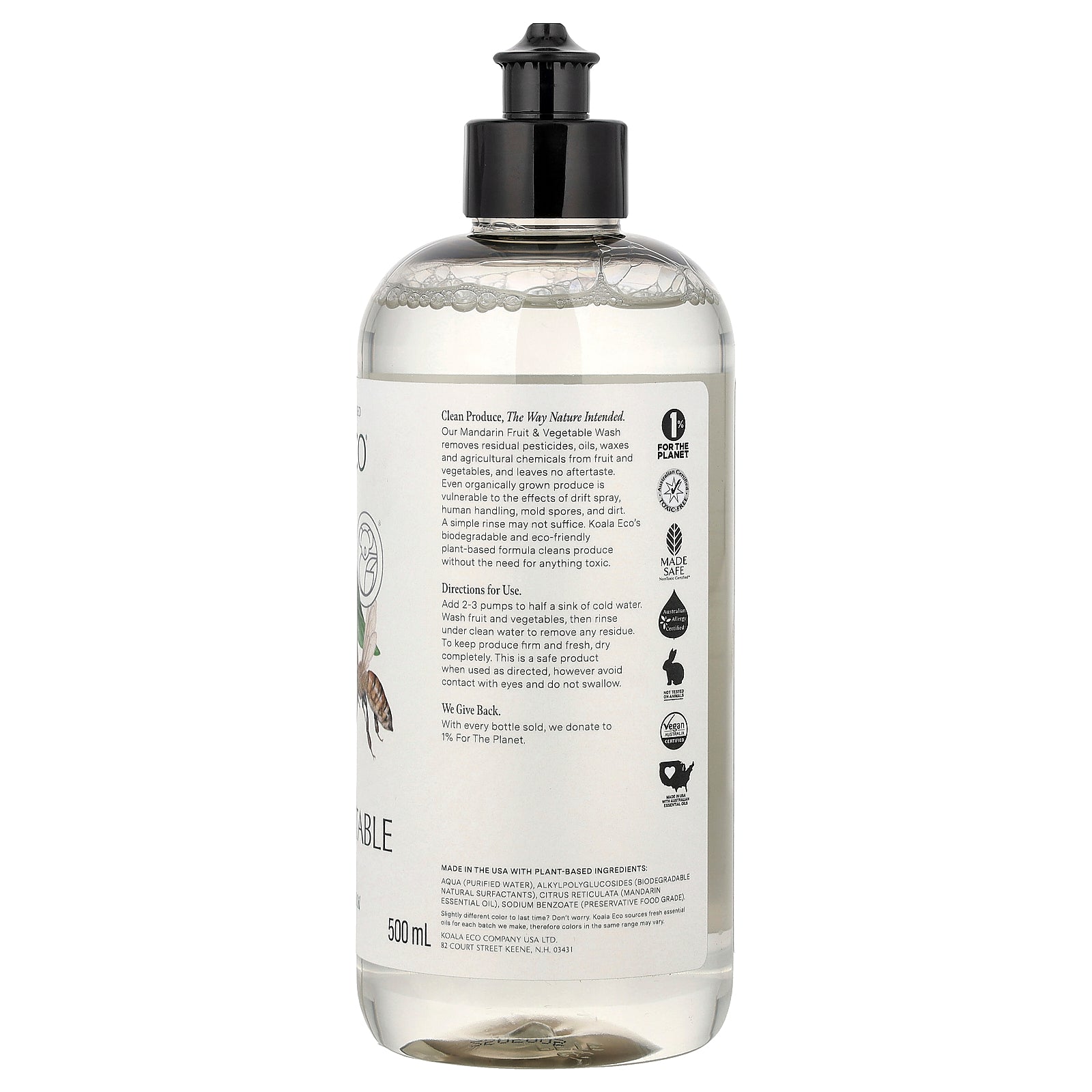 Our Mandarin Fruit & Vegetable Wash removes residual pesticides, oils, waxes and agricultural chemicals from fruit and vegetables, and leaves no aftertaste. Even organically grown produce is vulnerable to the effects of drift spray, human handling, mold spores, and dirt. A simple rinse may not suffice. Koala Eco's biodegradable and eco-friendly plant-based formula cleans produce without the need for anything toxic.