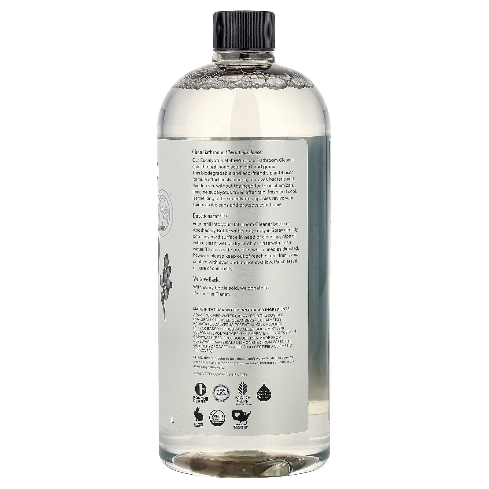 Made in the USA with plant-based ingredients: Purified water, alkyl polyglucosides (naturally derived cleansers), eucalyptus radiata (eucalyptus essential oil), alcohol (sugar based biodegradable), sodium xylene sulfonate, polyglyceryl-4 caprate, polyglyceryl-6 caprylate (peg free solubilizer made from renewable materials), limonene (from essential oil), dehydroacetic acid (eco certified cosmetic approved).