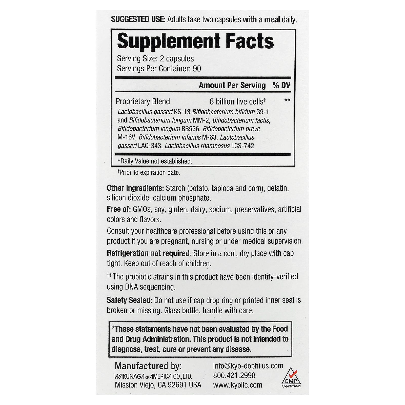 Kyo-Dophilus® Multi 9 Probiotic contains a diverse community of nine beneficial bacteria that includes The Friendly Trio®, L. gasseri KS-13, B. bifidum G9-1, and B.longum MM-2, along with B.infantis, B.breve and L.rhamnosus and other compatible species. This multi-strain blend can help populate your microbiome with beneficial bacteria to promote strong GI health and help you maintain a balanced digestive and immune system.