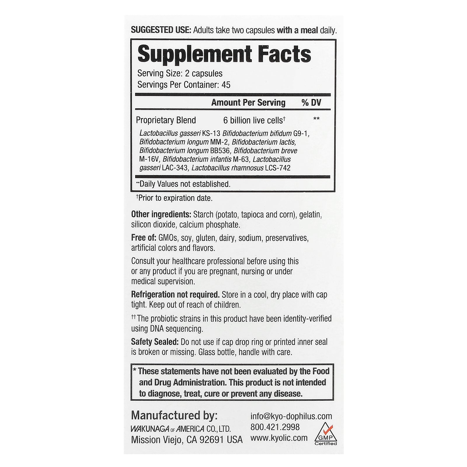 Kyo-Dophilus® Multi 9 Probiotic contains a diverse community of nine beneficial bacteria that includes The Friendly Trio®, L. gasseri KS-13, B. bifidum G9-1, and B.longum MM-2, along with B.infantis, B.breve and L.rhamnosus and other compatible species. This multi-strain blend can help populate your microbiome with beneficial bacteria to promote strong GI health and help you maintain a balanced digestive and immune system.