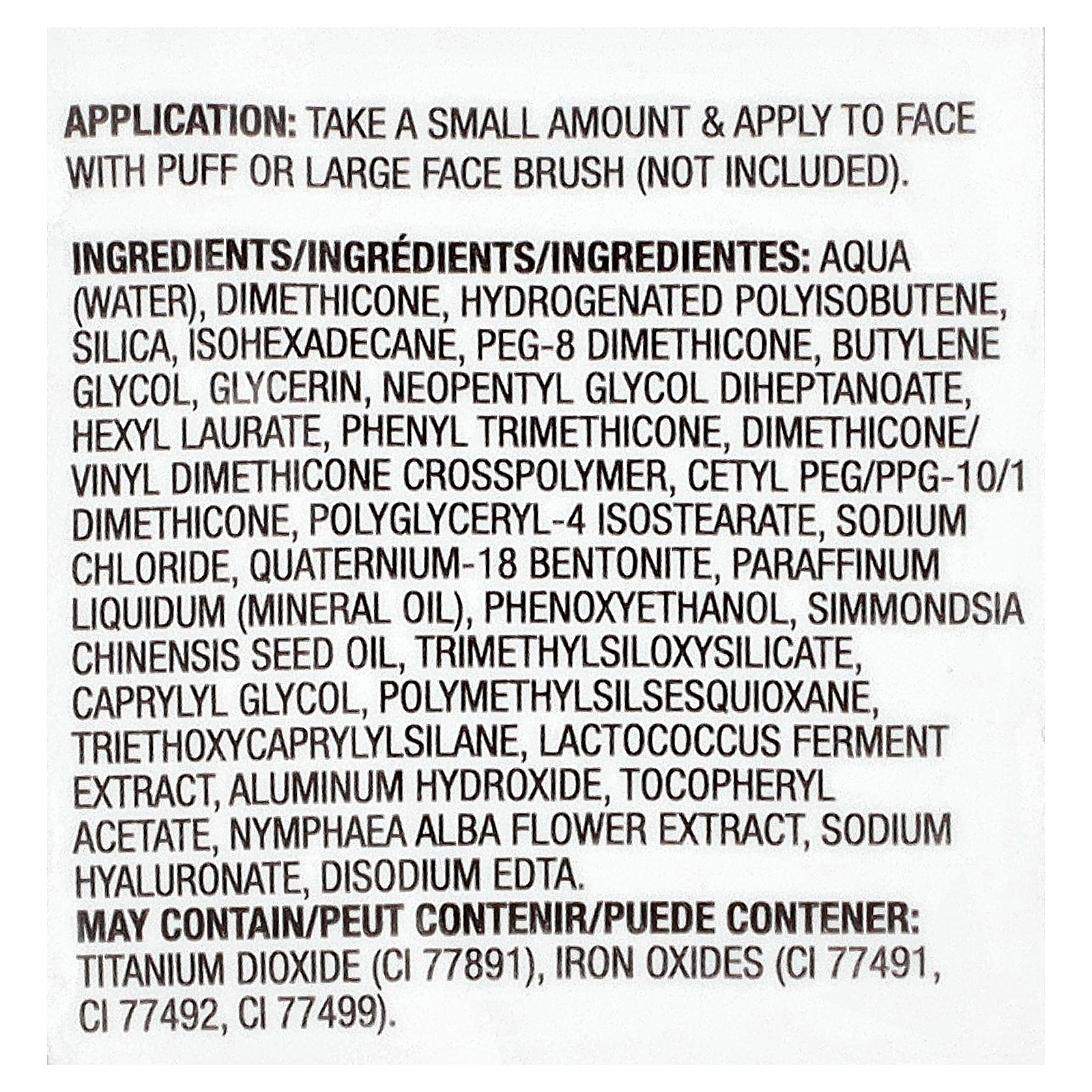 Aqua (water), dimethicone, hydrogenated polyisobutene, silica, isohexadecane, peg-8 dimethicone, butylene glycol, glycerin, neopentyl glycol diheptanoate, hexyl laurate, phenyl trimethicone, dimethicone/ vinyl dimethicone crosspolymer, cetyl peg/ppg-10/1 dimethicone, polyglyceryl-4 isostearate, sodium chloride, quaternium-18 bentonite, paraffinum liquidum (mineral oil), phenoxyethanol, simmondsia chinensis seed oil, trimethylsiloxysilicate, caprylyl glycol, polymethylsilsesquioxane, triethoxycaprylylsilane, lactococcus ferment extract, aluminum hydroxide, tocopheryl acetate, nymphaea alba flower extract, sodium hyaluronate, disodium EDTA. May contain: titanium dioxide (ci 77891), iron oxides (ci 77491, ci 77492, ci 77499).