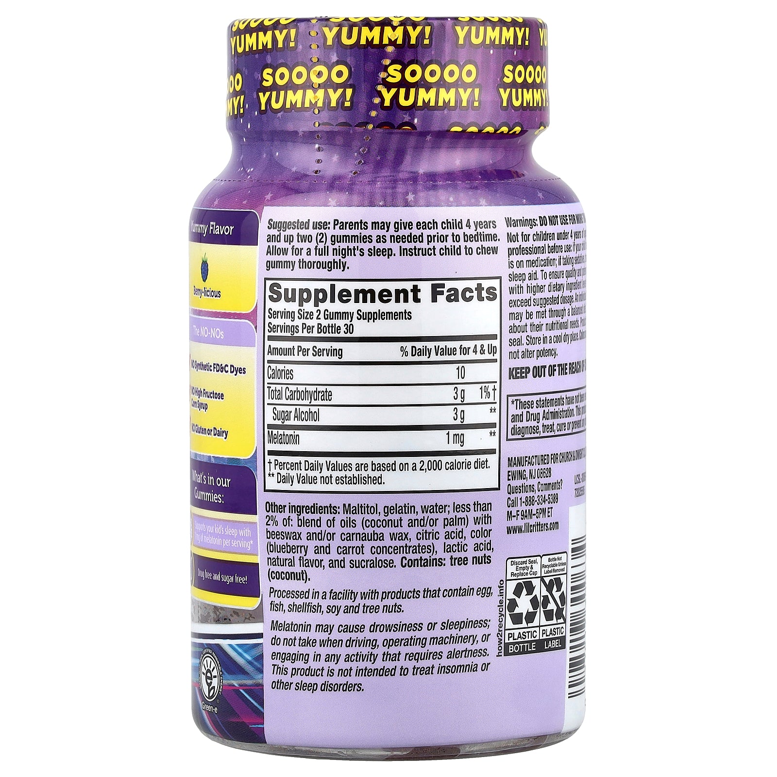 Maltitol, gelatin, water; less than 2% of: blend of oils (coconut and/or palm) with beeswax and/or carnauba wax, citric acid, color (blueberry and carrot concentrates), lactic acid, natural flavor, and sucralose.
