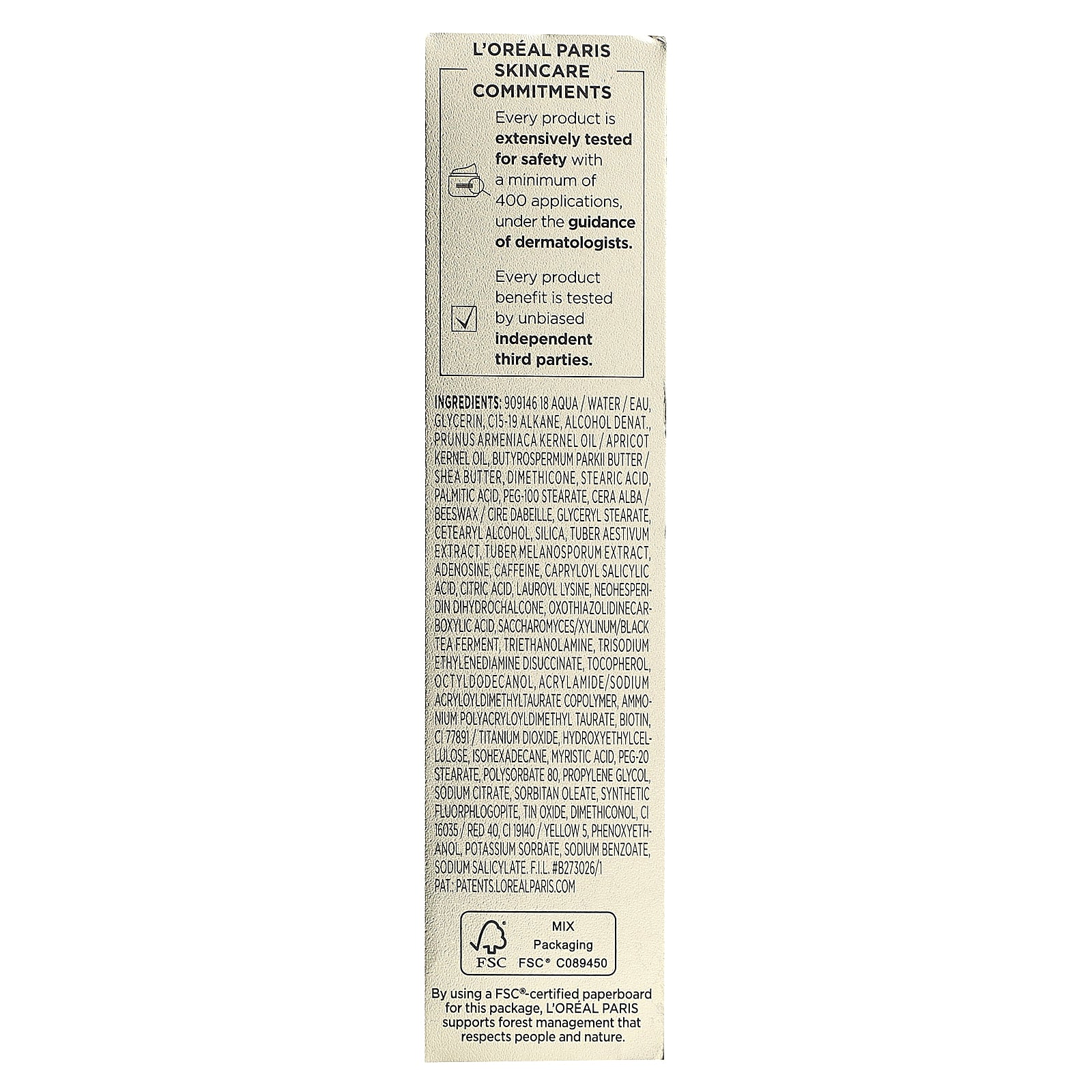 Water, glycerin, c15-19 alkane, alcohol denat., prunus armeniaca kernel oil / apricot kernel oil, butyrospermum parkii butter shea butter, dimethicone, stearic acid palmitic acid, peg-100 stearate, cera alba / beeswax, glyceryl stearate, cetearyl alcohol, silica, tuber aestivum extract, tuber melanosporum extract, adenosine, caffeine, capryloyl salicylic acid, citric acid, lauroyl lysine, neohesperidin dihydrochalcone, oxothiazolidinecarboxylic acid, saccharomyces/xylinum/black tea ferment, triethanolamine, trisodium ethylenediamine disuccinate, tocopherol, octyldodecanol, acrylamide/sodium acryloyldimethyltaurate copolymer, ammonium polyacryloyldimethyl taurate, biotin, ci 77891 / titanium dioxide, hydroxyethylcellulose, isohexadecane, myristic acid, peg-20 stearate, polysorbate 80, propylene glycol, sodium citrate, sorbitan oleate, synthetic fluorphlogopite, tin oxide, dimethiconol, ci 16035/ red 40, ci 19140 / yellow 5, phenoxyethanol, potassium sorbate, sodium benzoate, sodium salicylate.