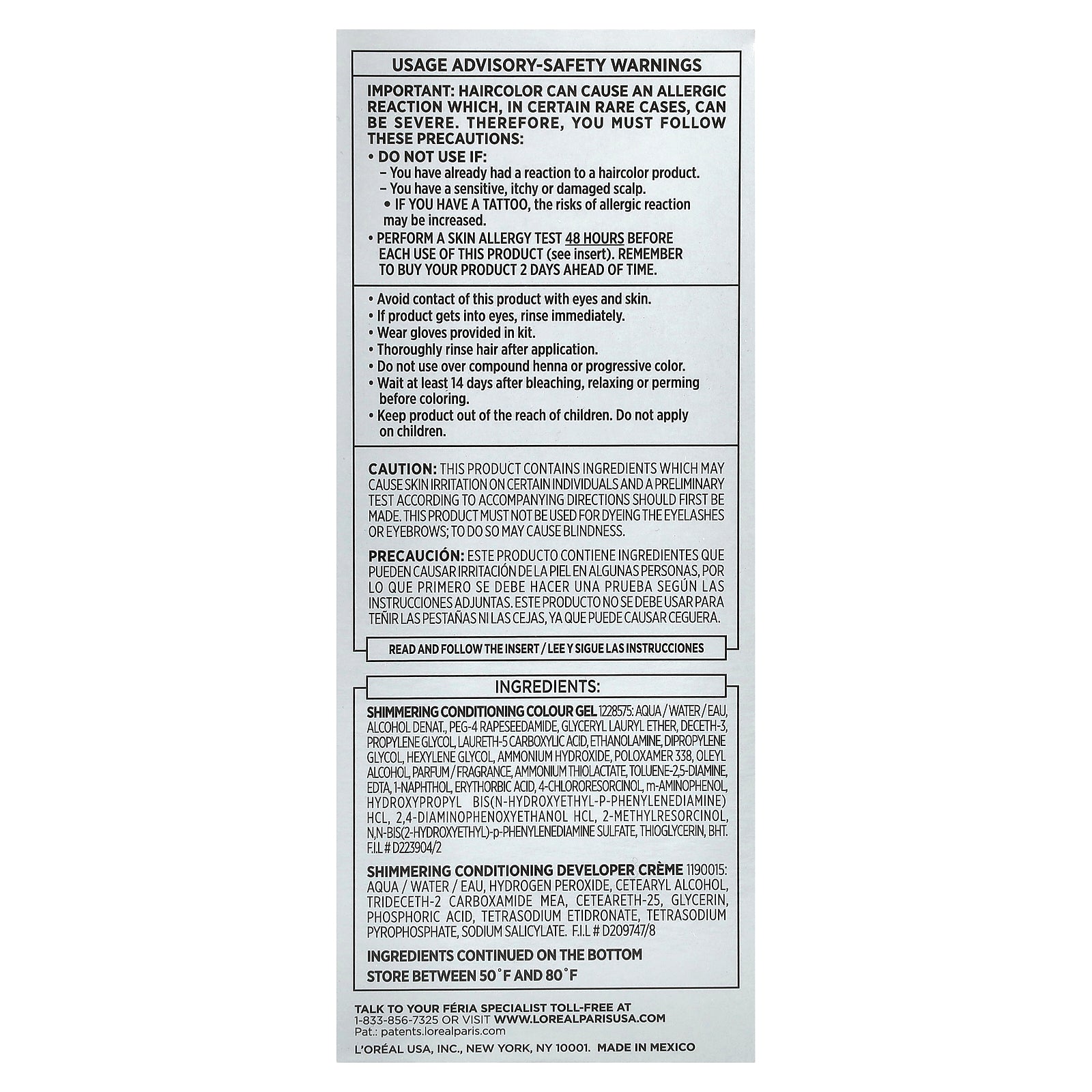 Shimmering conditioning colour gel: Aqua/water/eau, alcohol denat ., peg-4 rapeseedamide, glyceryl lauryl ether, deceth-3, propylene glycol, laureth-5 carboxylic acid, ethanolamine, dipropylene glycol, hexylene glycol, ammonium hydroxide, poloxamer 338, oleyl alcohol, parfum /fragrance, ammonium thiolactate, toluene-2,5-diamine, edta, 1-naphthol, erythorbic acid, 4-chlororesorcinol, m-aminophenol, hydroxypropyl bis(n-hydroxyethyl-p-phenylenediamine) hcl, 2,4-diaminophenoxyethanol hcl, 2-methylresorcinol, n,n-bis(2-hydroxyethyl)-p-phenylenediamine sulfate, thioglycerin, bht.