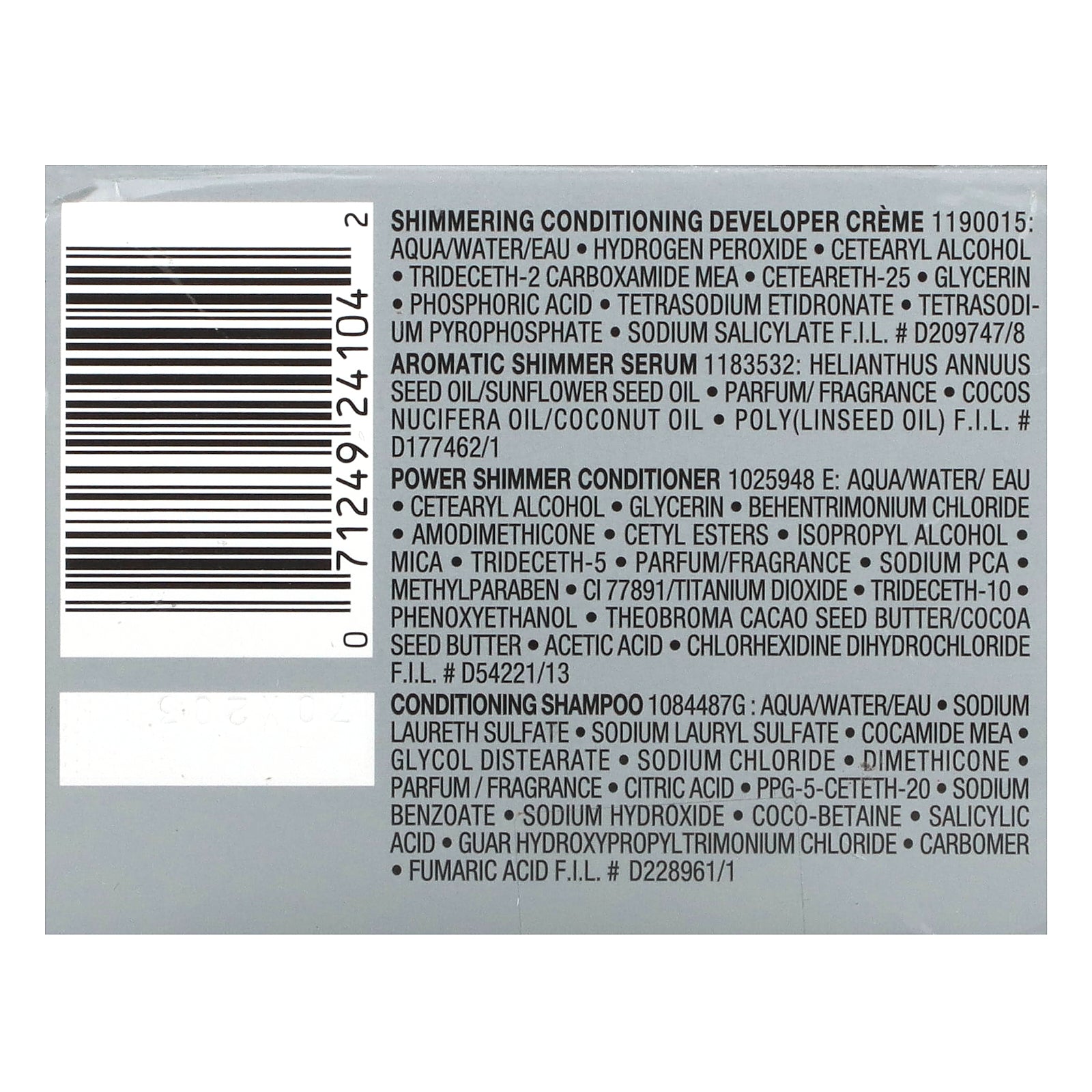 Shimmering conditioning developer crème: Aqua/water/eau, hydrogen peroxide, cetearyl alcohol, trideceth-2 carboxamide mea, ceteareth-25, glycerin, phosphoric acid, tetrasodium etidronate, tetrasodium pyrophosphate, sodium salicylate.