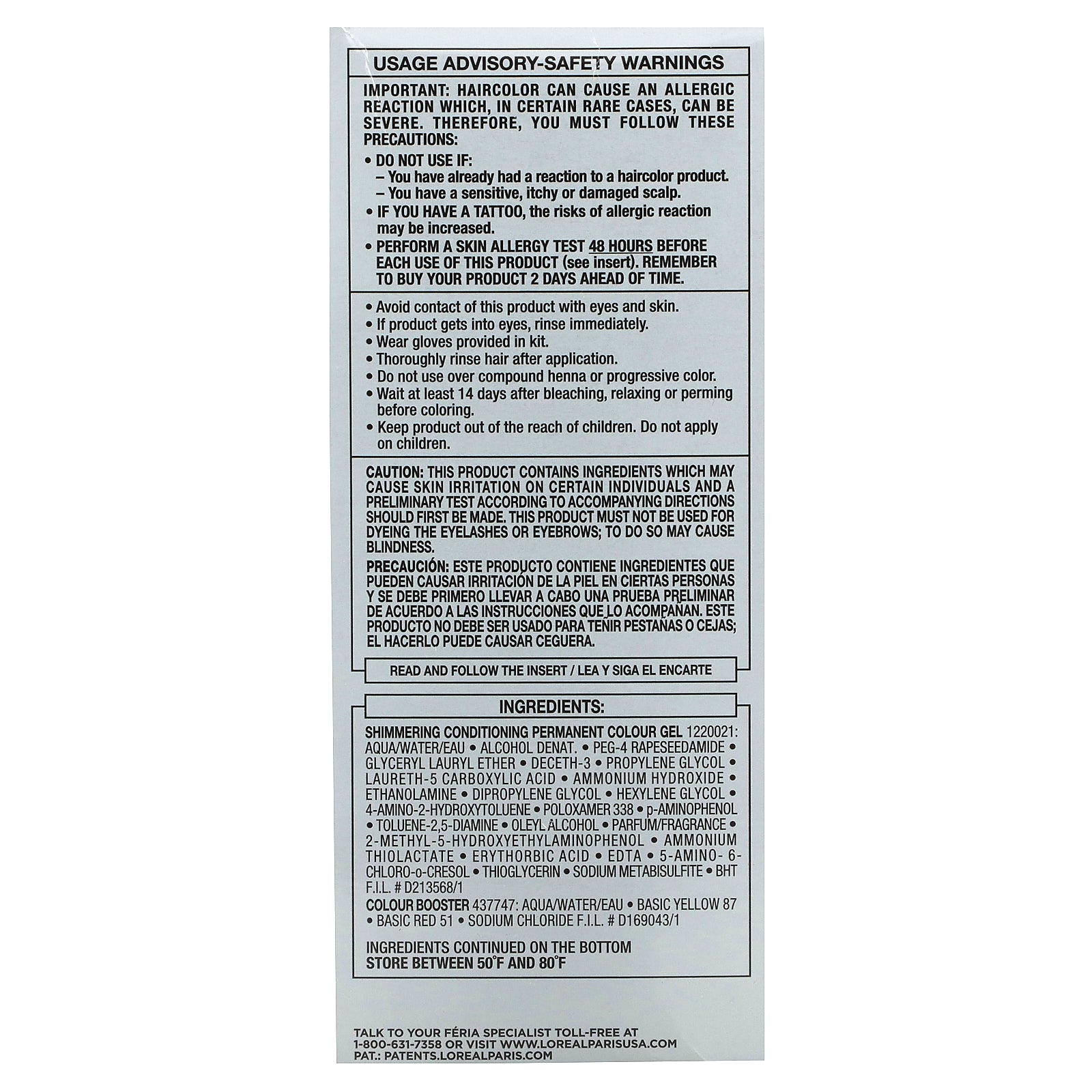 Shimmering conditioning permanent colour gel: Aqua/water/eau, alcohol denat,. peg-4 rapeseedamide, glyceryl lauryl ether, deceth-3, propylene glycol, laureth-5 carboxylic acid, ammonium hydroxide, ethanolamine, dipropylene glycol, hexylene glycol, 4-amino-2-hydroxytoluene, poloxamer 338, p-aminophenol, toluene-2,5-diamine, oleyl alcohol, parfum/fragrance, 2-methyl-5-hydroxyethylaminophenol, ammonium thiolactate, erythorbic acid, edta, 5-amino-6-chloro-0-cresol, thioglycerin, sodium metabisulfite, bht.