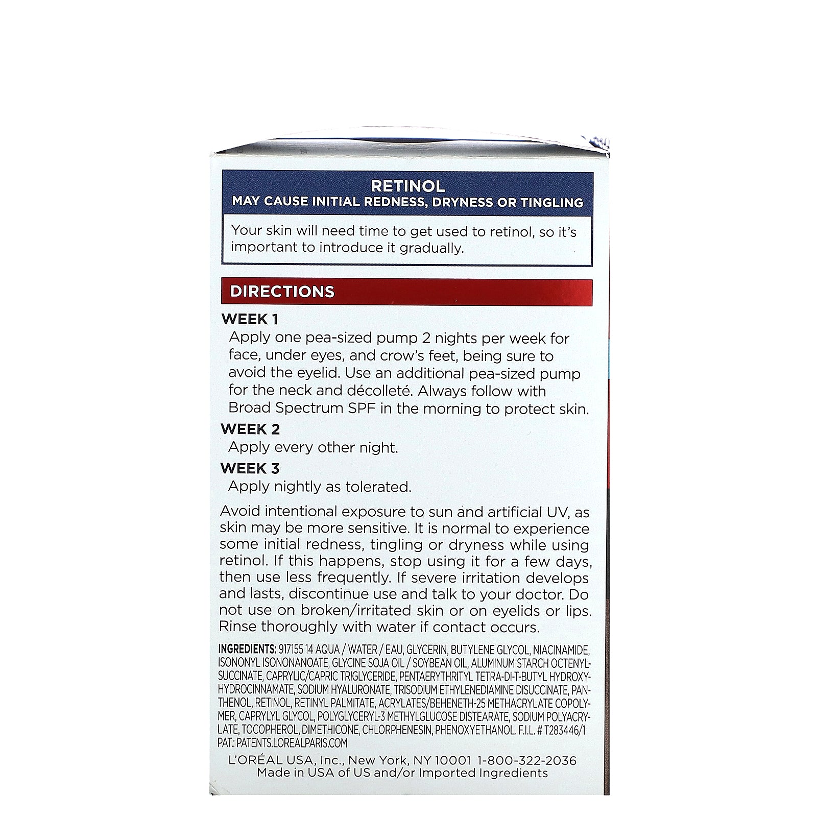 Avoid intentional exposure to sun and artificial UV, as skin may be more sensitive. It is normal to experience some initial redness, tingling or dryness while using retinol. If this happens, stop using it for a few days, then use less frequently. If severe irritation develops and lasts, discontinue use and talk to your doctor. Do not use on broken/irritated skin or on eyelids or lips. Rinse thoroughly with water if contact occurs.