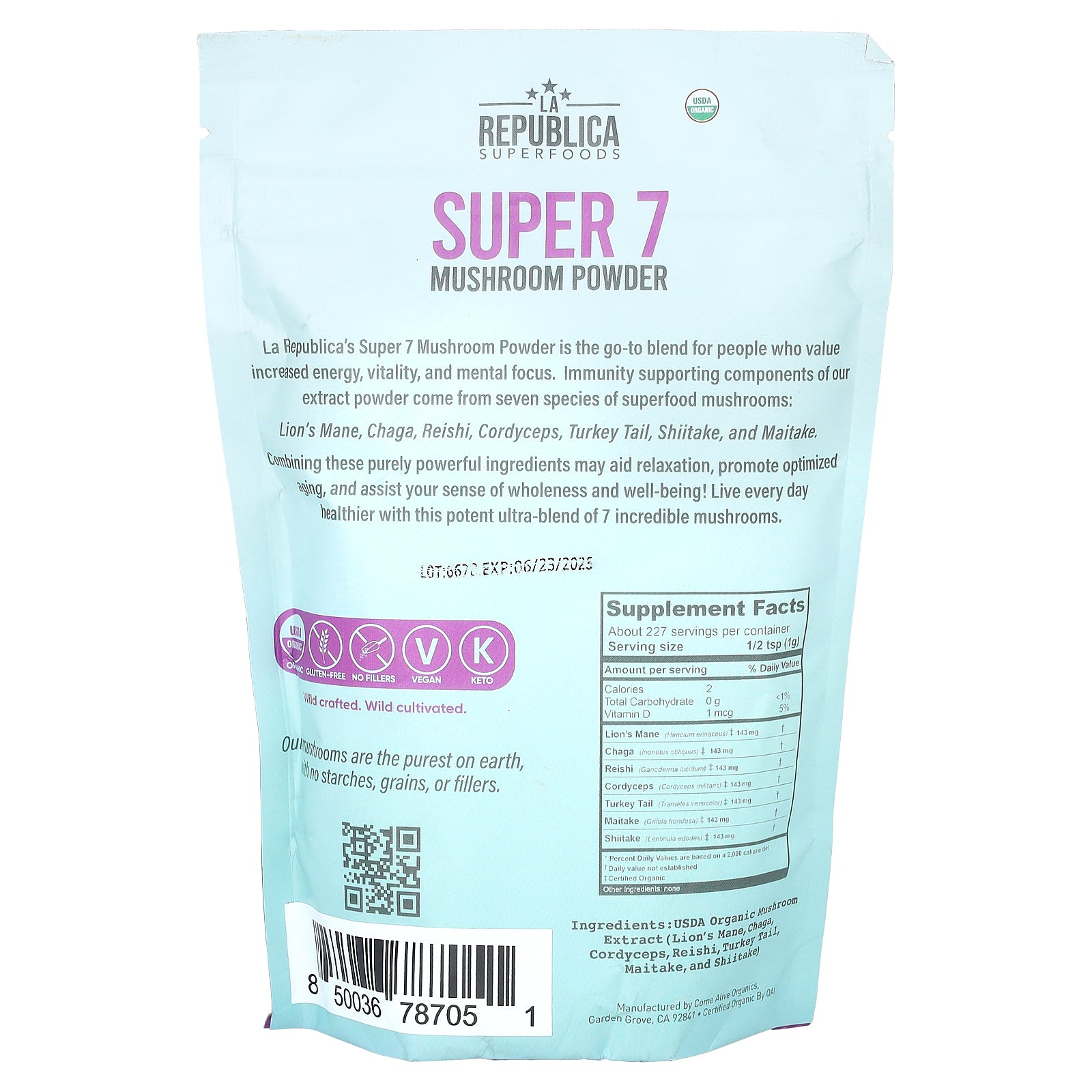 La Republica's Super 7 Mushroom Powder is the go-to blend for people who value increased energy, vitality, and mental focus. Immunity supporting components of our extract powder come from seven species of superfood mushrooms: Lion's Mane, Chaga, Reishi, Cordyceps, Turkey Tail, Shiitake, and Maitake.