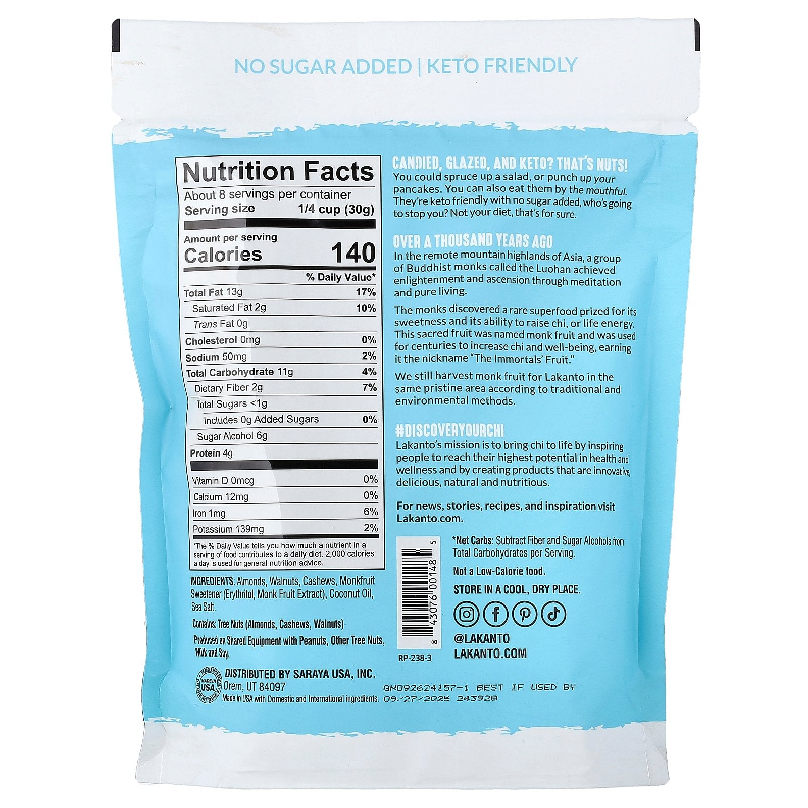 Almonds, walnuts, cashews, monkfruit sweetener (erythritol, monk fruit extract), coconut oil, sea salt.