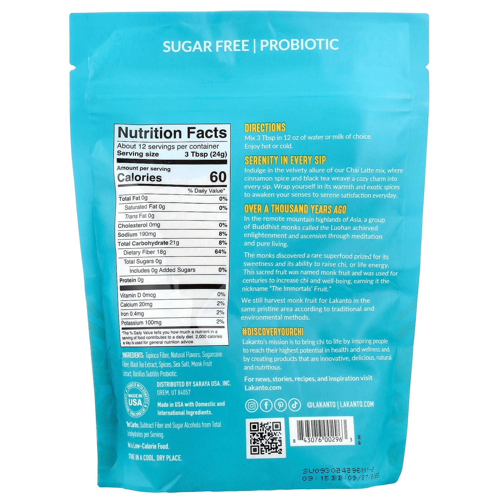 Tapioca fiber, natural flavors, sugarcane fiber, black tea extract, spices, sea salt, monk fruit extract, bacillus subtilis probiotic.