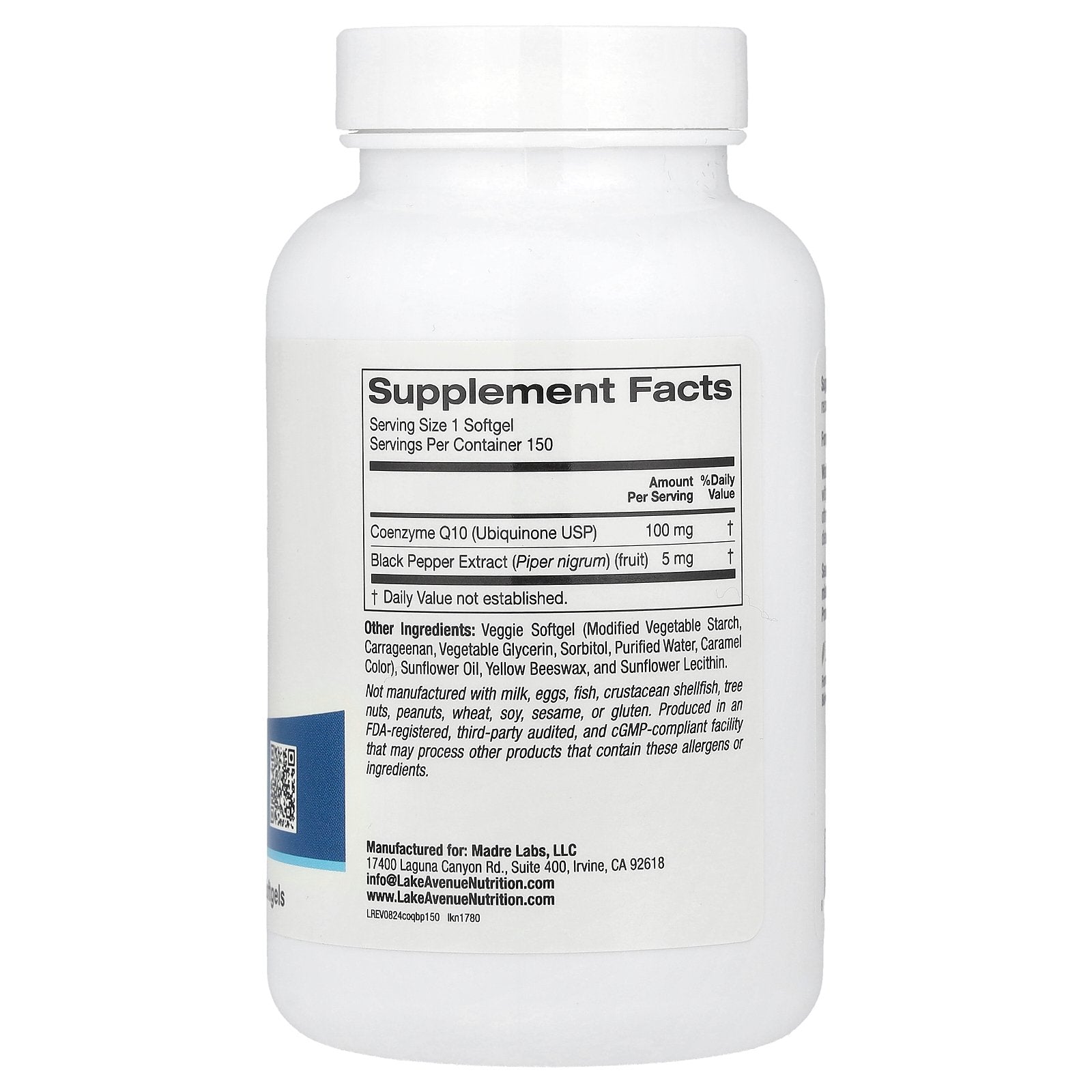 Lake Avenue® Nutrition CoQ10 Plus BioPerine® ️contains coenzyme Q10 and a patented black pepper (Piper nigrum) extract for enhanced absorption.