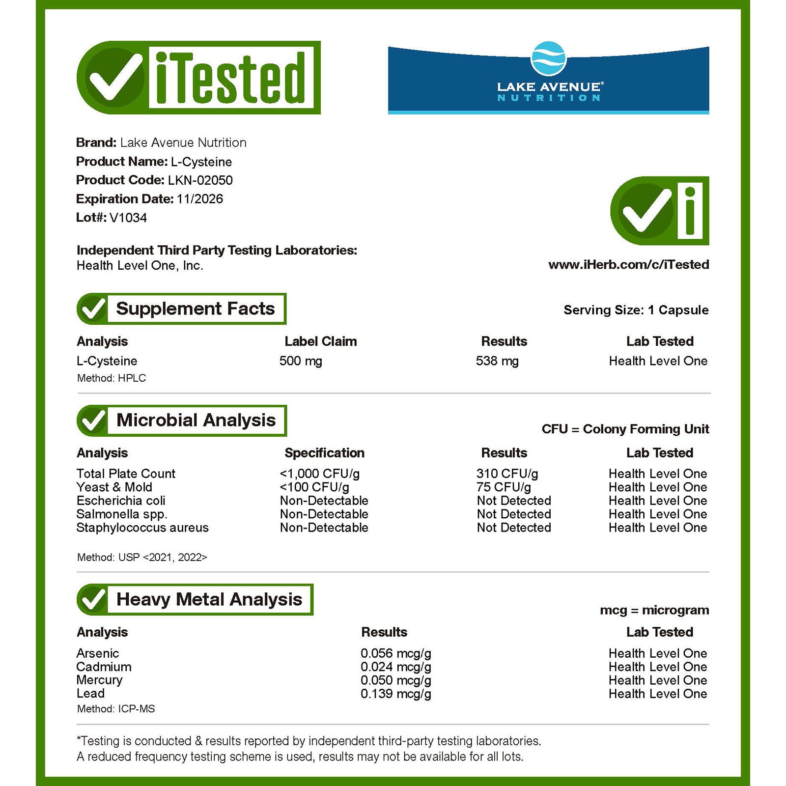 Lake Avenue Nutrition L-Cysteine contains this non-essential amino acid in veggie capsules. It is suitable for vegetarians and formulated without gluten, GMOs, or soy.