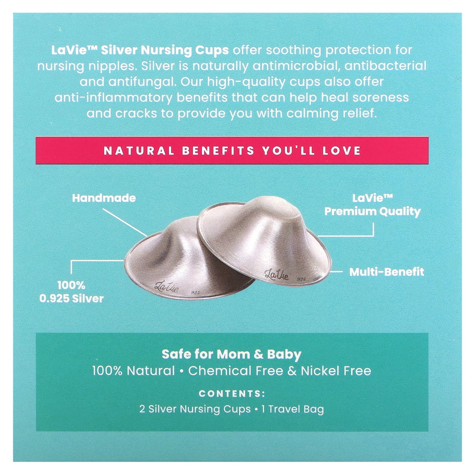 LaVie™ Silver Nursing Cups offer soothing protection for nursing nipples. Silver is naturally antimicrobial, antibacterial and antifungal. Our high-quality cups also offer anti-inflammatory benefits that can help heal soreness and cracks to provide you with calming relief.