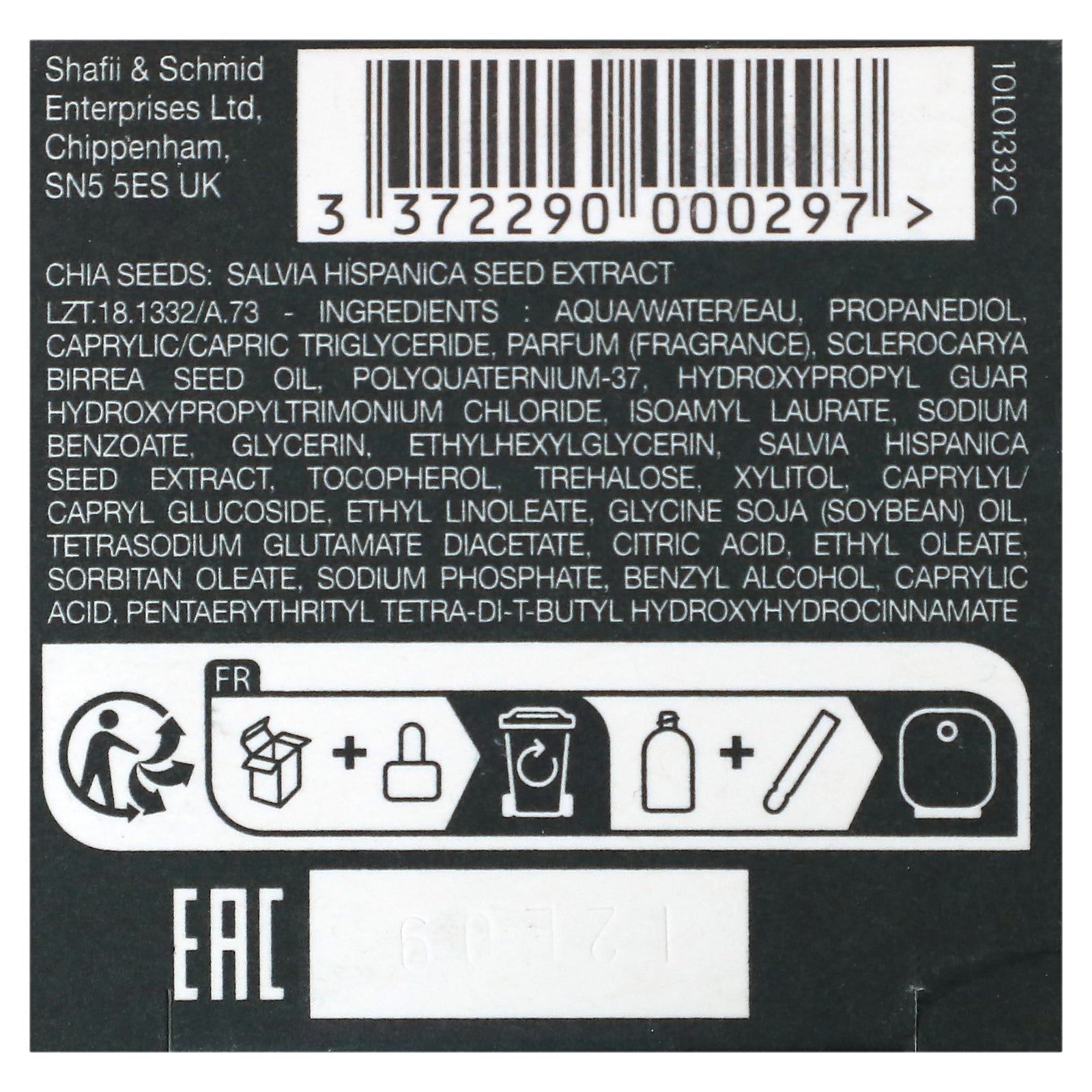 Aqua/water/eau, propanediol, caprylic/capric triglyceride, parfum (fragrance), sclerocarya birrea seed oil, polyquaternium-37. hydroxypropyl guar hydroxypropyltrimonium chloride, isoamyl laurate, sodium benzoate, glycerin, ethylhexylglycerin, salvia hispanica seed extract, tocopherol, trehalose, xylitol, caprylyl/capryl glucoside, ethyl linoleate, glycine soja (soybean) oil, tetrasodium glutamate diacetate, citric acid, ethyl oleate, sorbitan oleate, sodium phosphate, benzyl alcohol, caprylic acid, pentaerythrityl tetra-di-t-butyl hydroxyhydrocinnamate.