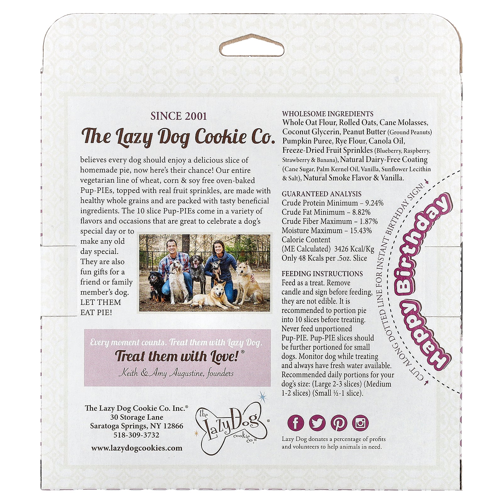 The Lazy Dog Cookie Co. believes every dog should enjoy a delicious slice of homemade pie, now here's their chance! Our entire vegetarian line of wheat, corn & soy free oven-baked Pup-PIEs, topped with real fruit sprinkles, are made with healthy whole grains and are packed with tasty beneficial ingredients. The 10 slice Pup-PIEs come in a variety of flavors and occasions that are great to celebrate a dog's special day or to make any old day special. They are also fun gifts for a friend or family member's dog. Let them eat pie!