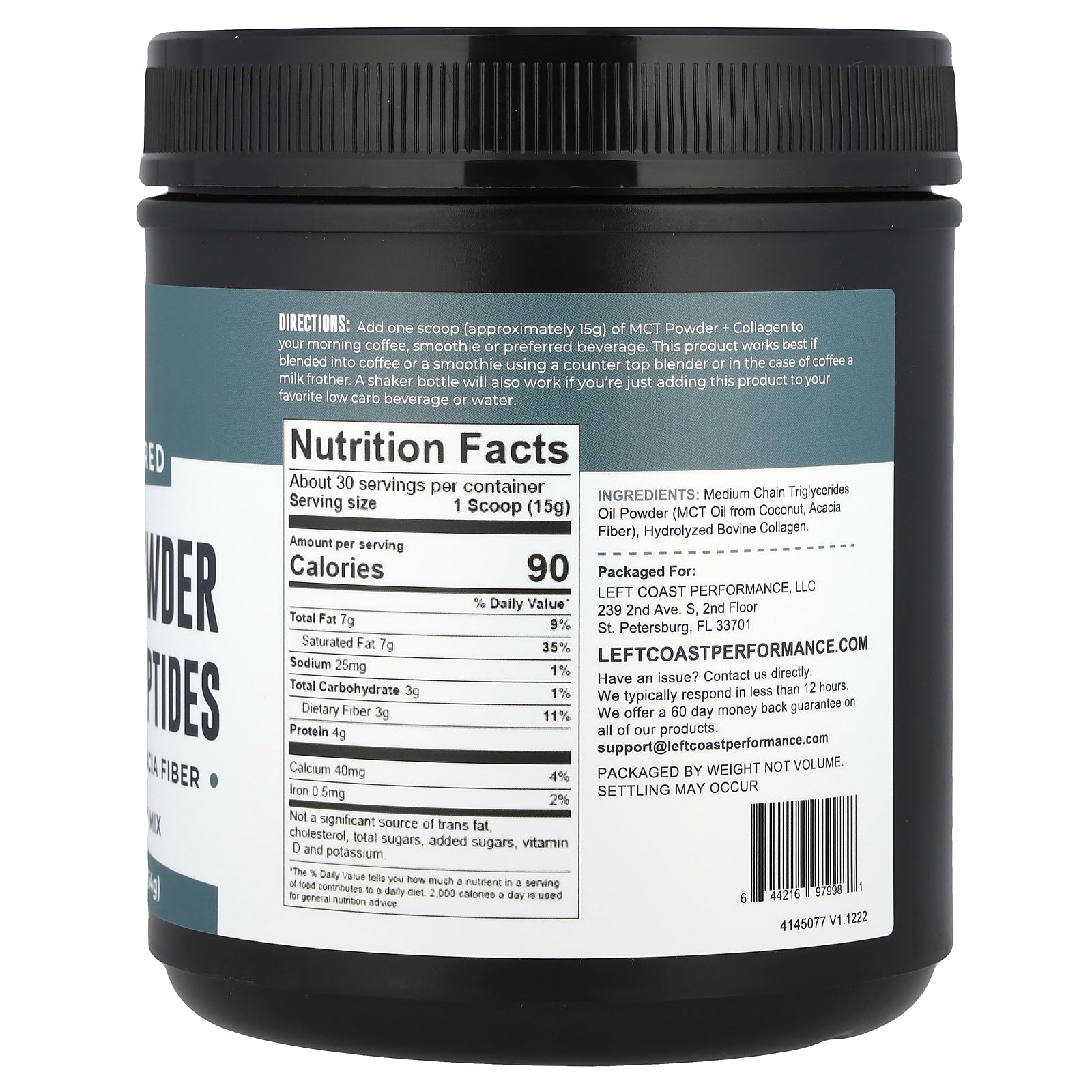 Medium chain triglycerides oil powder (MCT oil from coconut, acacia fiber), hydrolyzed bovine collagen.