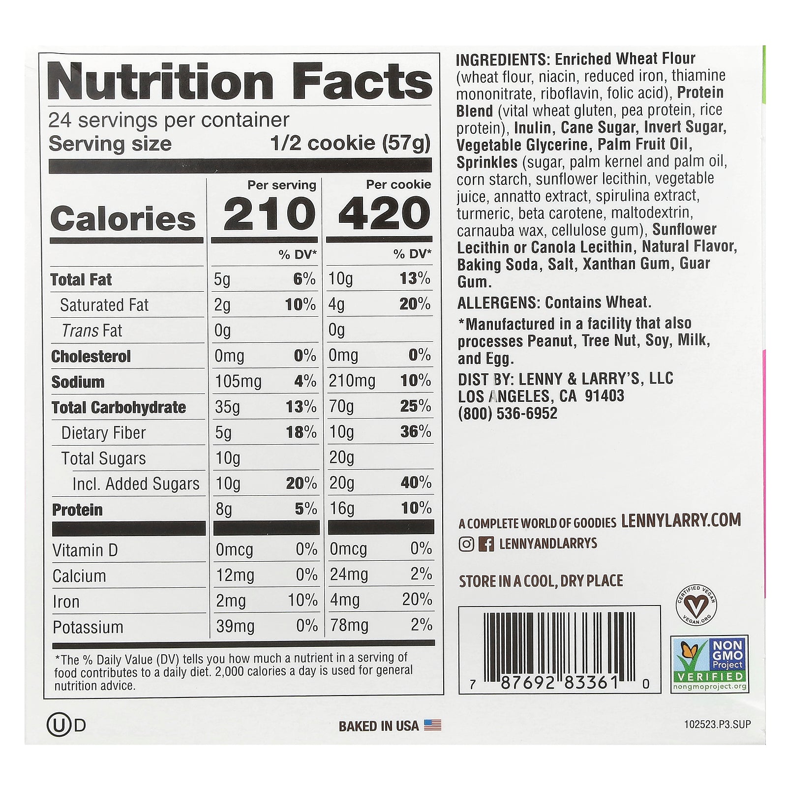 Enriched wheat flour (wheat flour, niacin, reduced iron, thiamine mononitrate, riboflavin, folic acid), protein blend (vital wheat gluten, pea protein, rice protein), inulin, cane sugar, invert sugar, vegetable glycerine, palm fruit oil, sprinkles (sugar, palm kernel and palm oil, corn starch, sunflower lecithin, vegetable juice, annatto extract, spirulina extract, turmeric, beta carotene, maltodextrin, carnauba wax, cellulose gum), sunflower lecithin or canola lecithin, natural flavor, baking soda, salt, xanthan gum, guar gum.