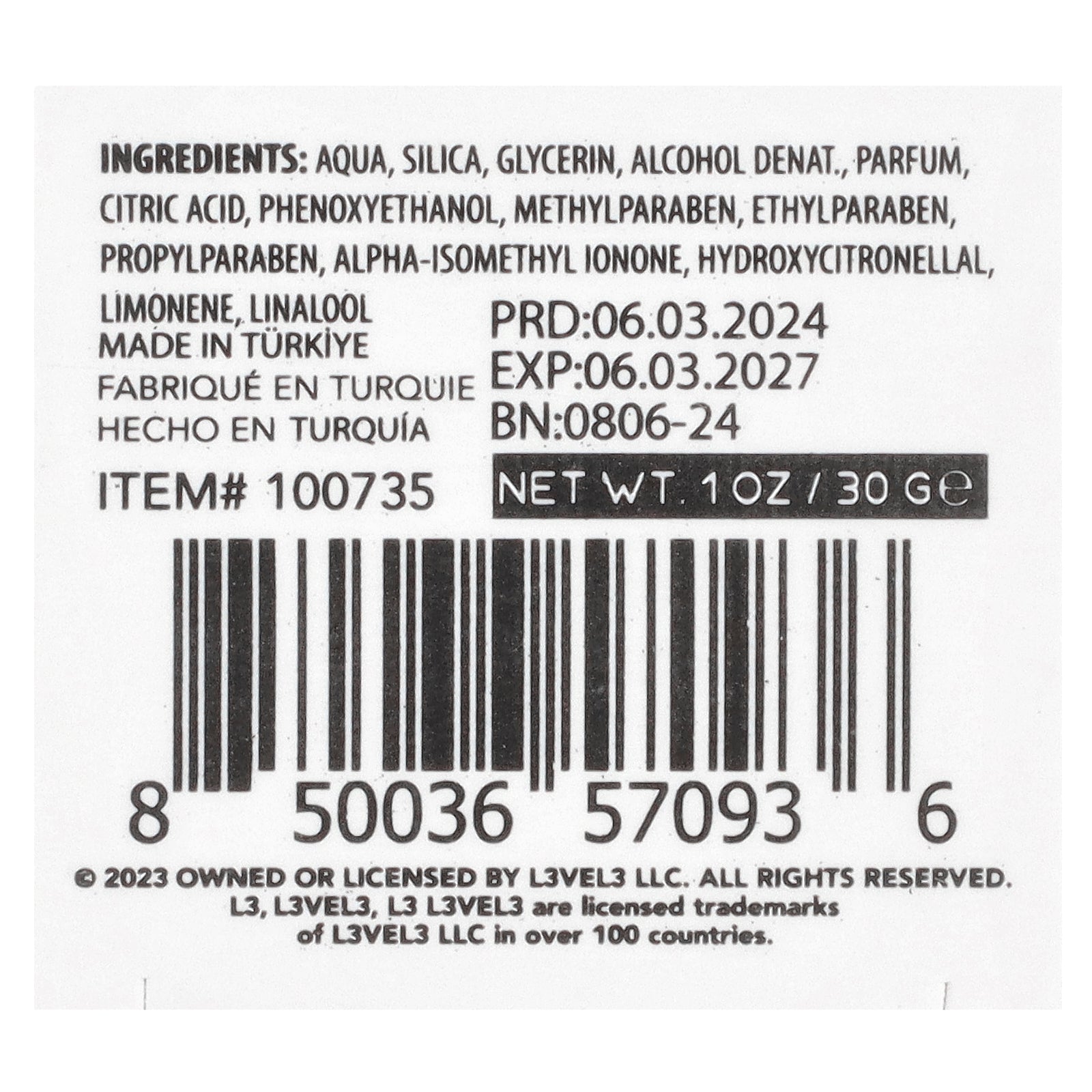 Aqua, silica, glycerin, alcohol denat., parfum (fragrance), phenoxyethanol, citric acid, methylparaben, ethylparaben, propylparaben, limonene, linalool, alpha-isomethyl ionone, hydroxycitronellal.
