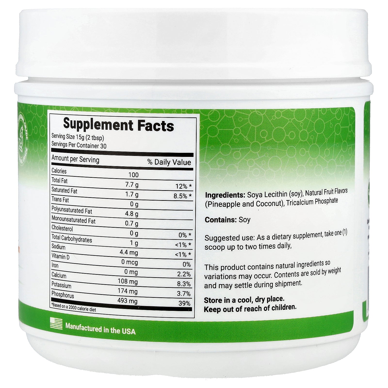 Soya lecithin (soy), natural fruit flavors (pineapple and coconut), tricalcium phosphate.