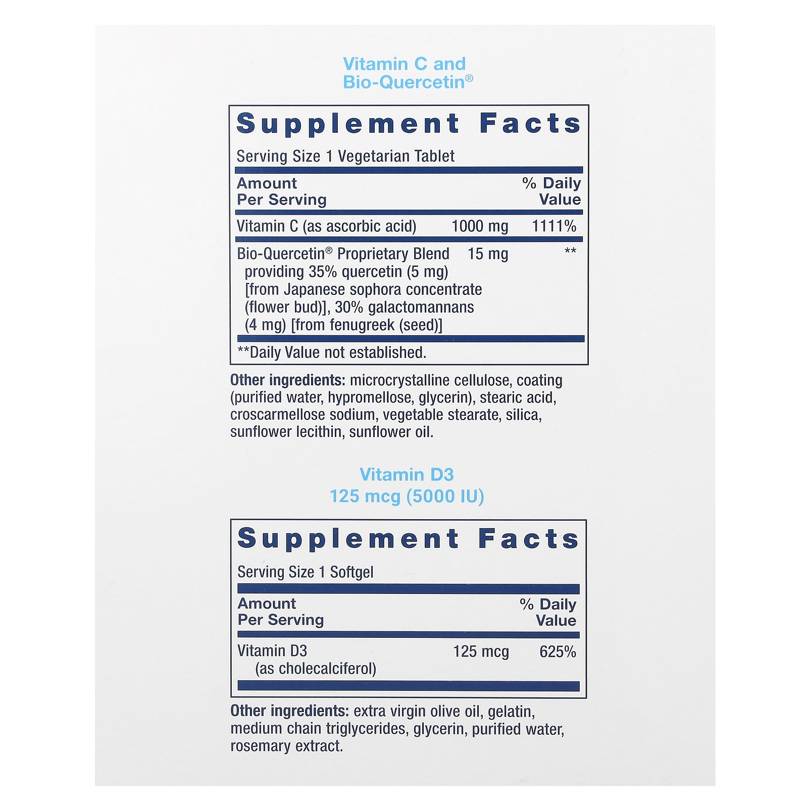 Vitamin C and Bio-Quercetin®: Microcrystalline cellulose, coating (purified water, hypromellose, glycerin), stearic acid, croscarmellose sodium, vegetable stearate, silica, sunflower lecithin, sunflower oil.