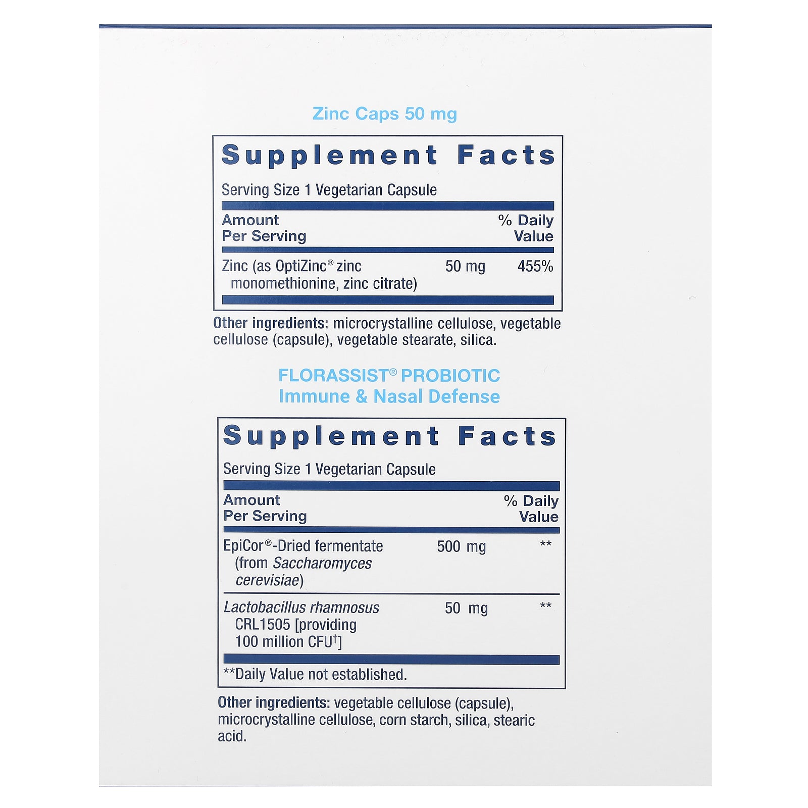 Zinc caps: Microcrystalline cellulose, vegetable cellulose (capsule), vegetable stearate, silica.