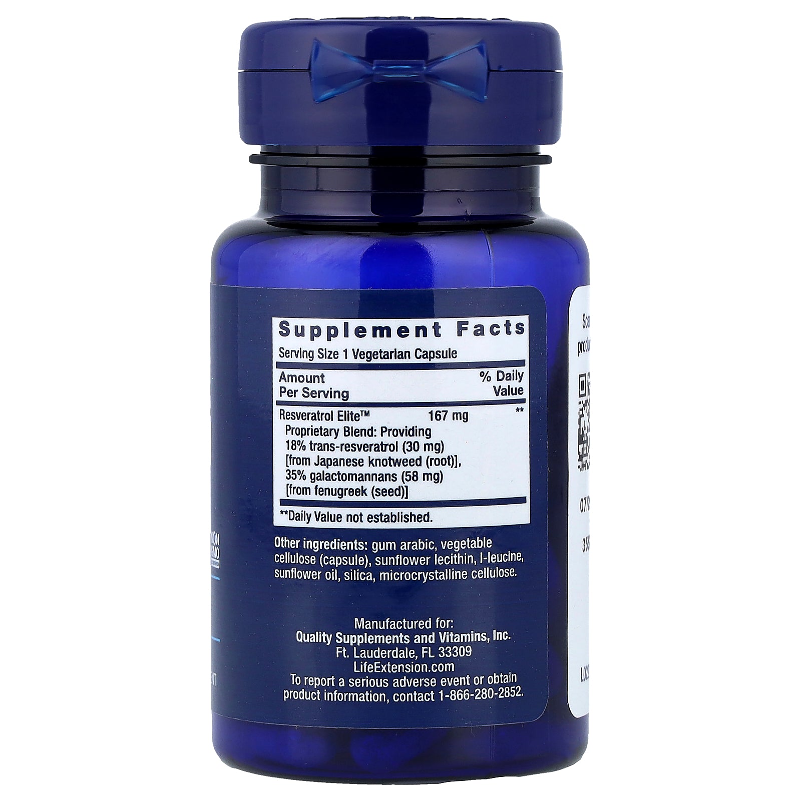 | Resveratrol Elite™ Proprietary Blend: Providing 18% trans-resveratrol (30 mg) [from Japanese knotweed (root)], 35% galactomannans (58 mg) [from fenugreek (seed)] |